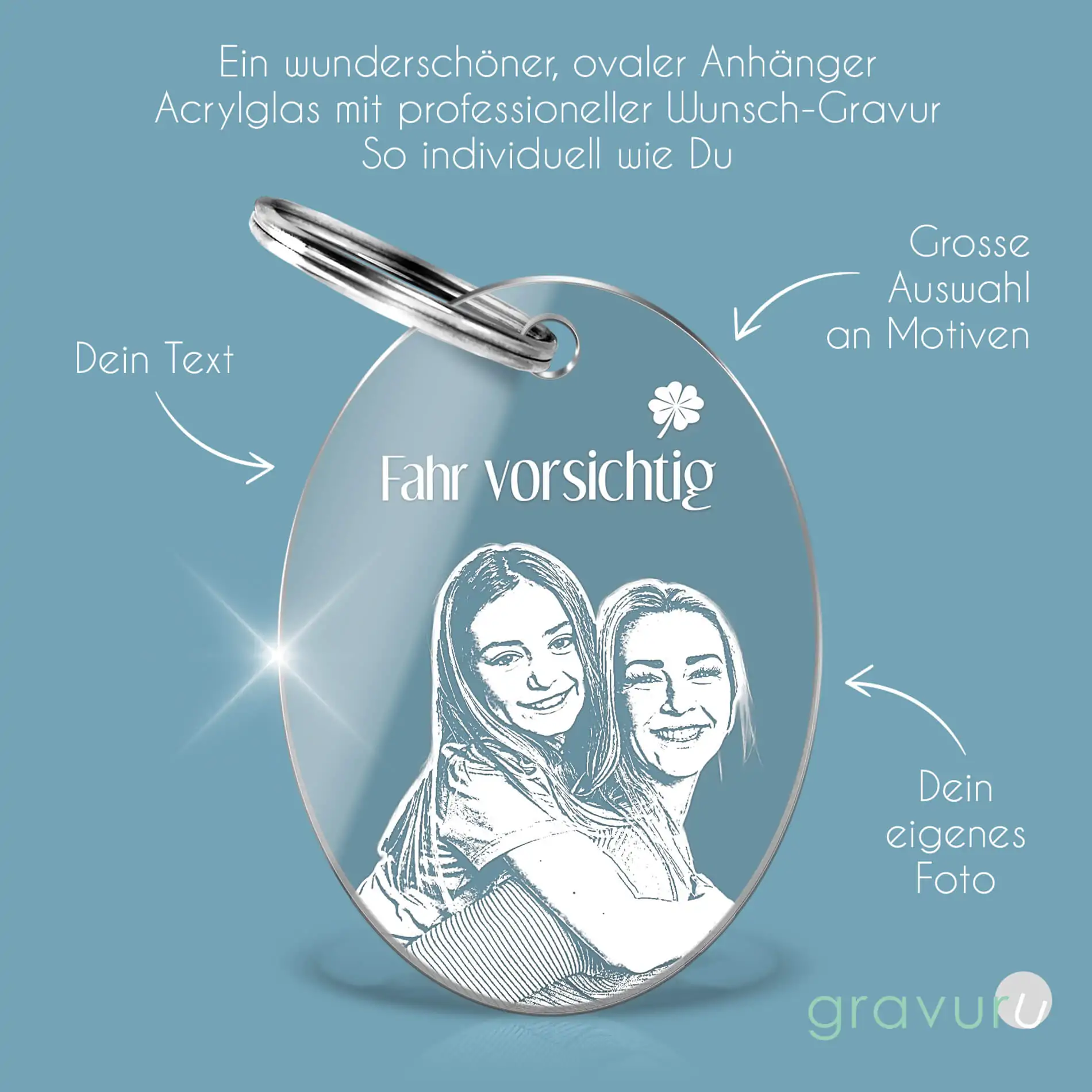 Zeige ihnen wie wichtig sie Dir sind. Der Anhänger aus klarem Acrylglas wird mit Deiner gewünschten Fotogravur und einer süßen Notiz zu einem einmaligen Hingucker. Lass Deine Liebsten immer eine Erinnerung bei sich tragen, welche für die Ewigkeit bleibt. Bereite ihnen eine unvergessliche Freude mit persönlicher Note.