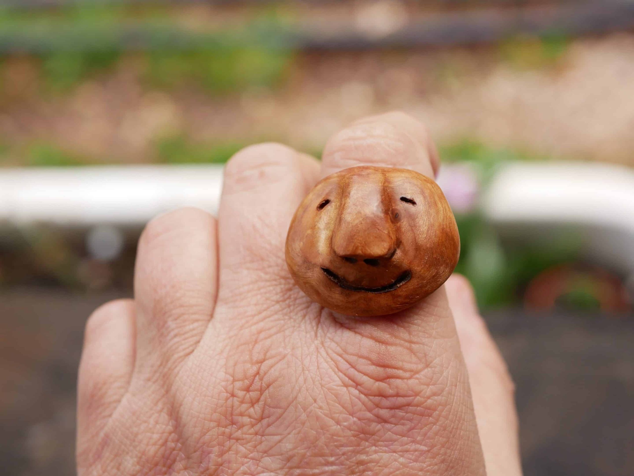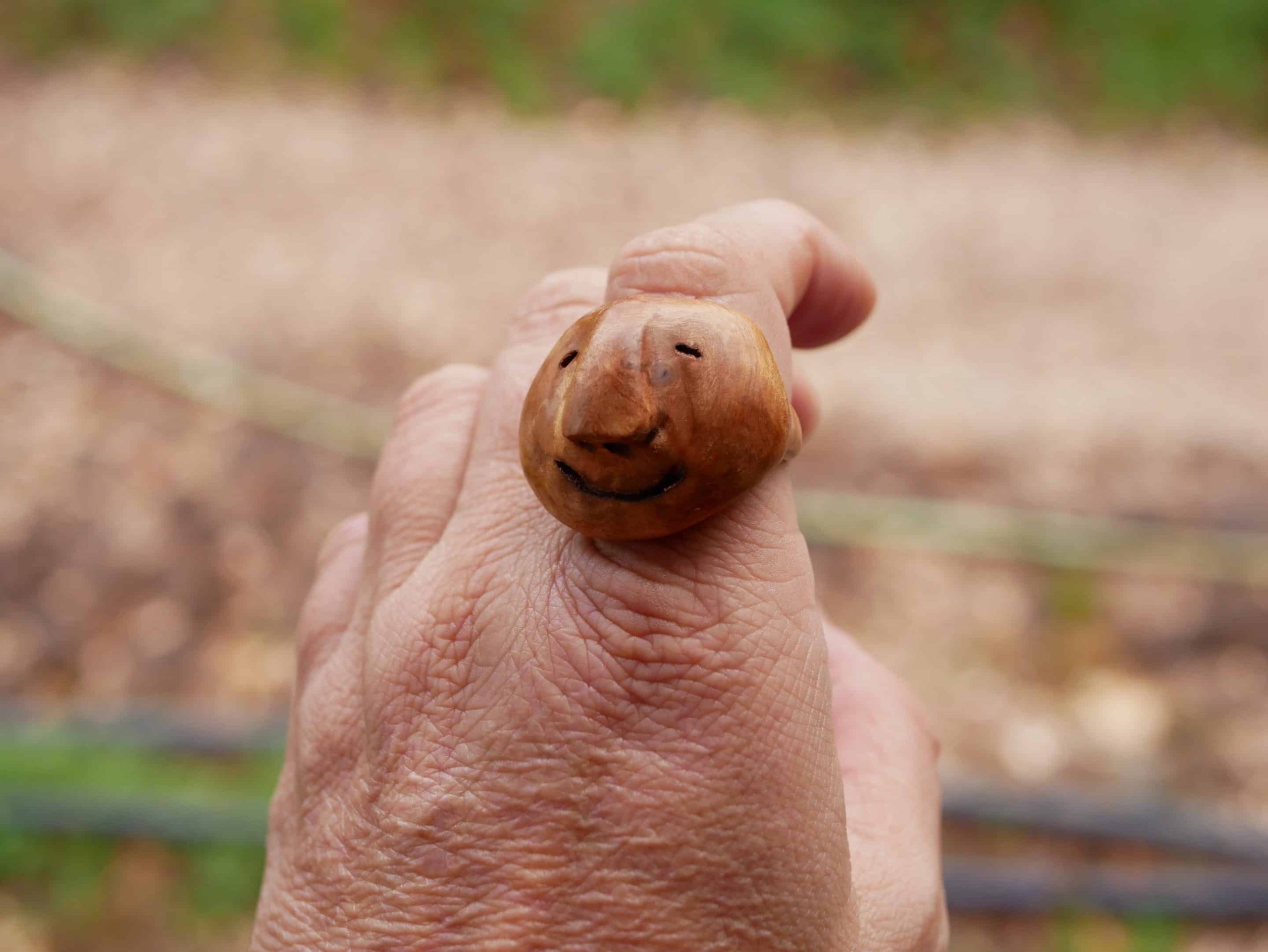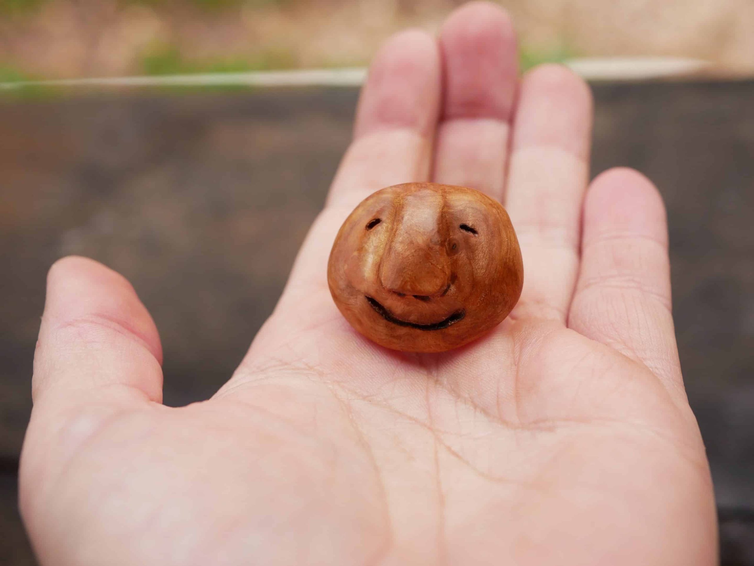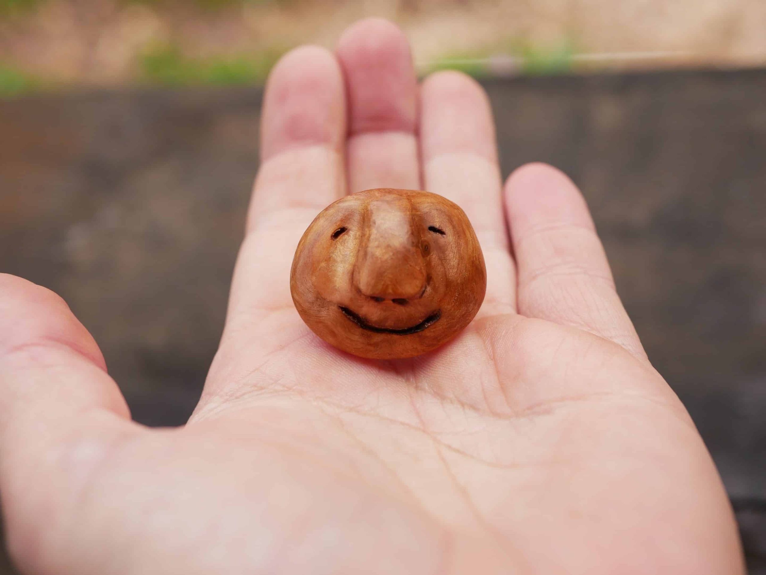 Mit viel Liebe zum Detail wurde ein kleines Wichtelgesicht in die Baumperle geschnitzt bzw heraus gekitzelt, das nun ausdrucksstark aus dem Holz hervorschaut.