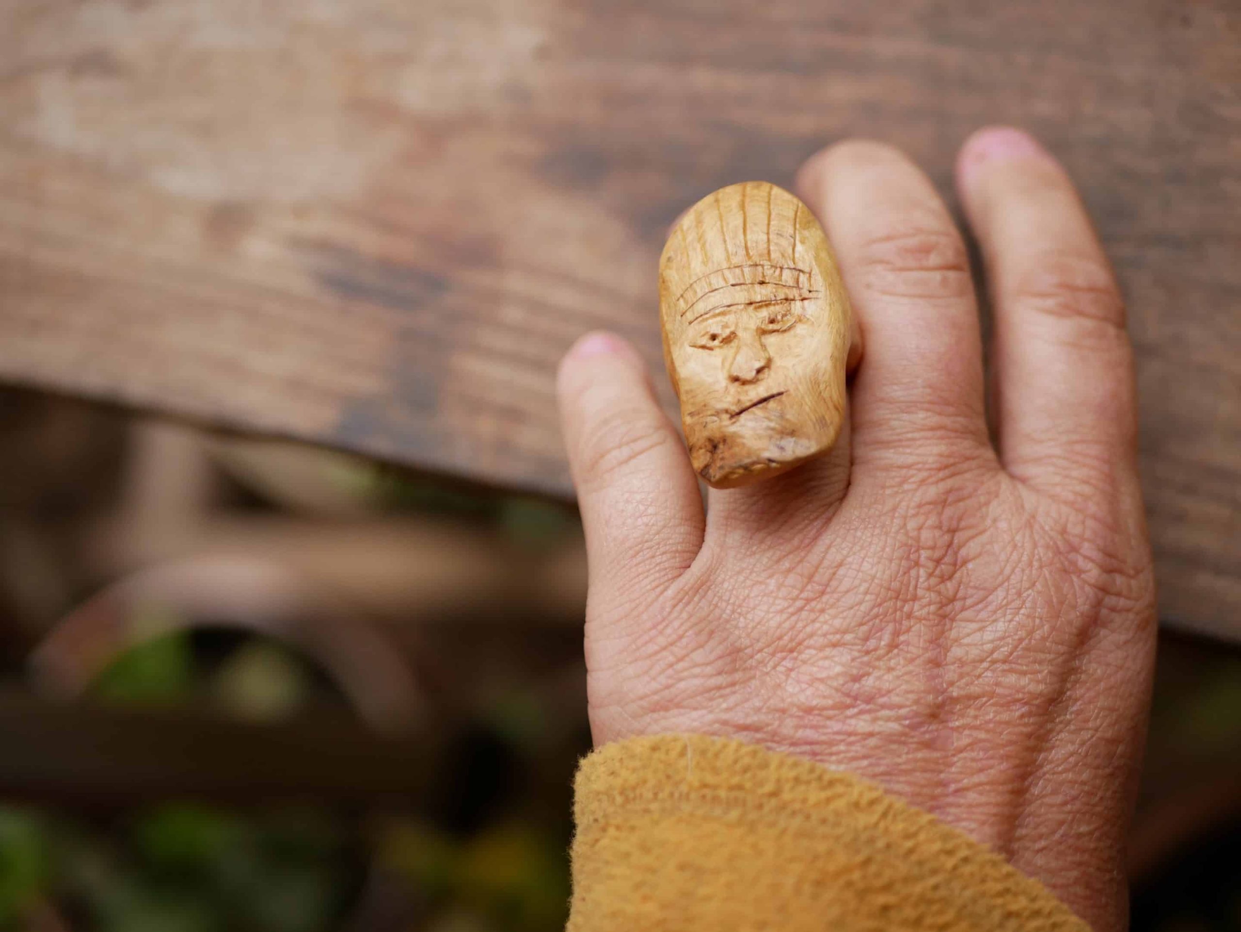 Dieser Ring ist etwas ganz Besonderes: Aus einer organisch geformten Baumperle handgefertigt und von mir mit einer indigenen Figur geschnitzt.