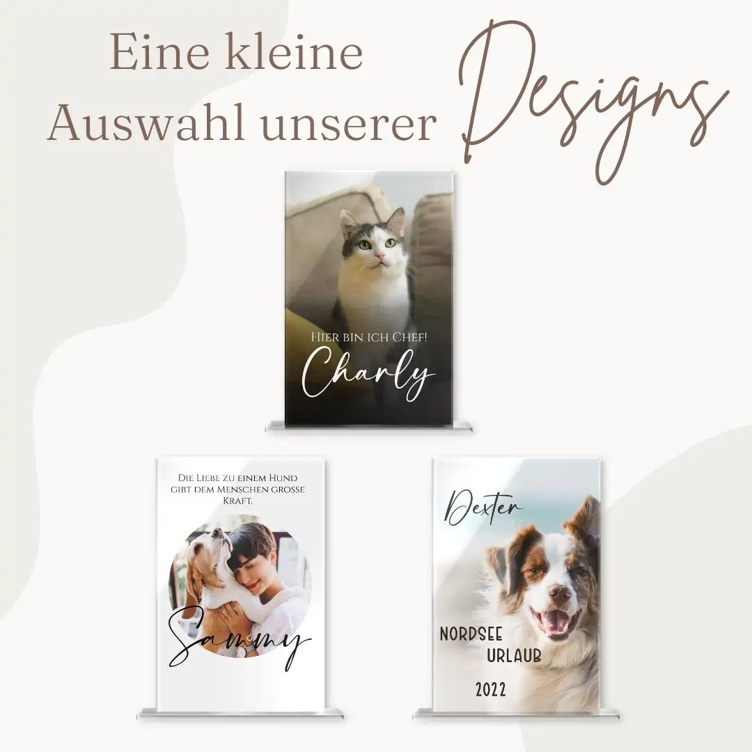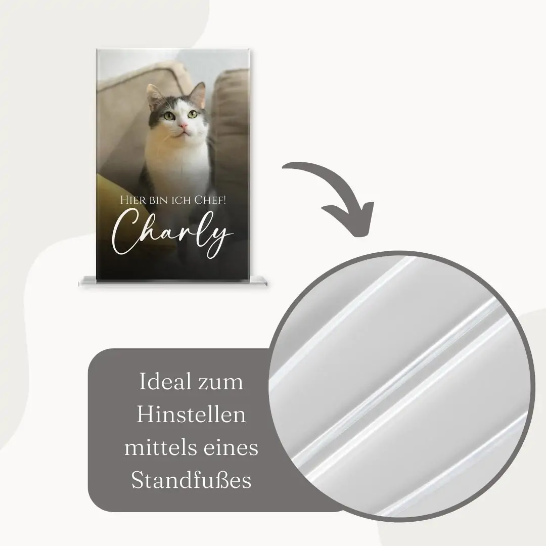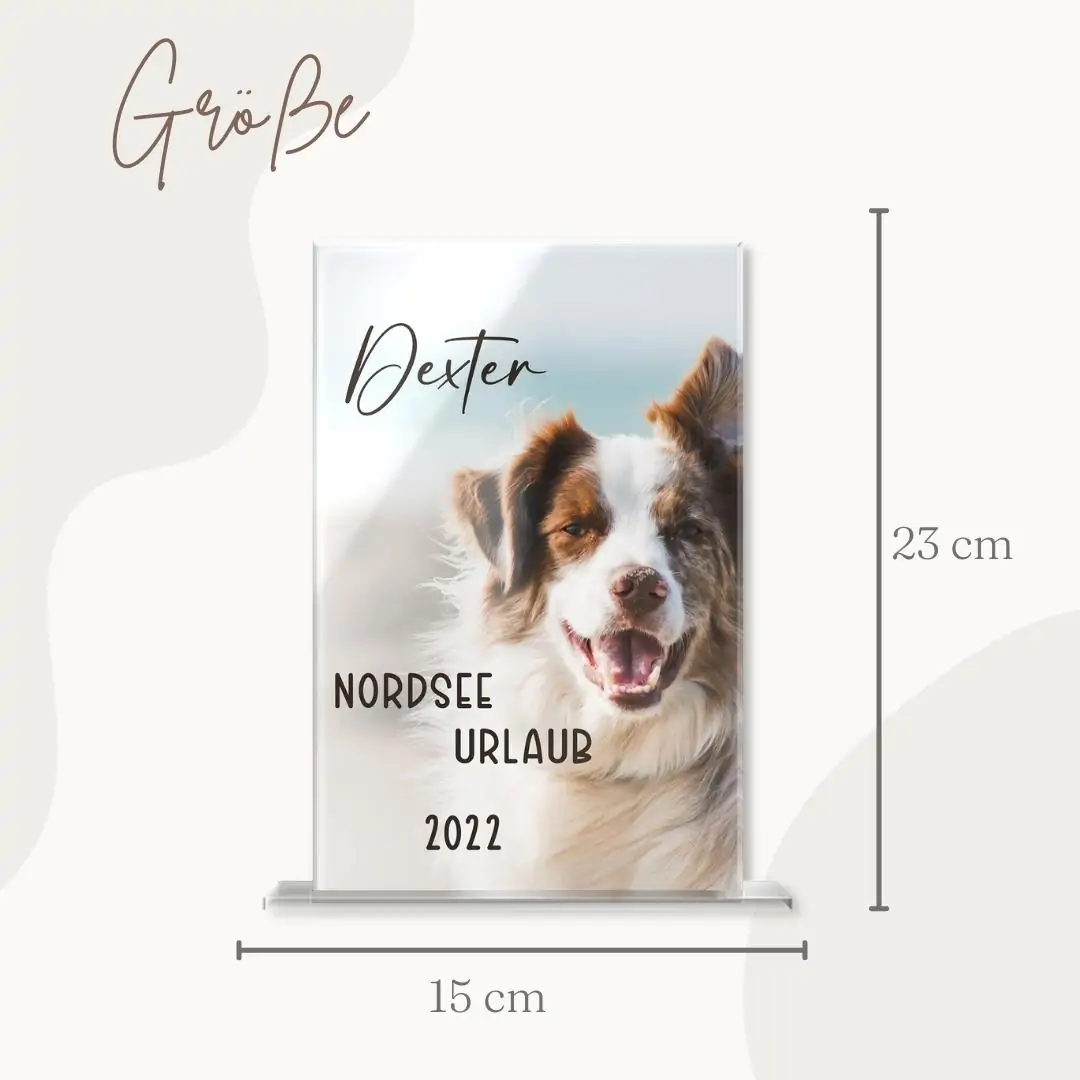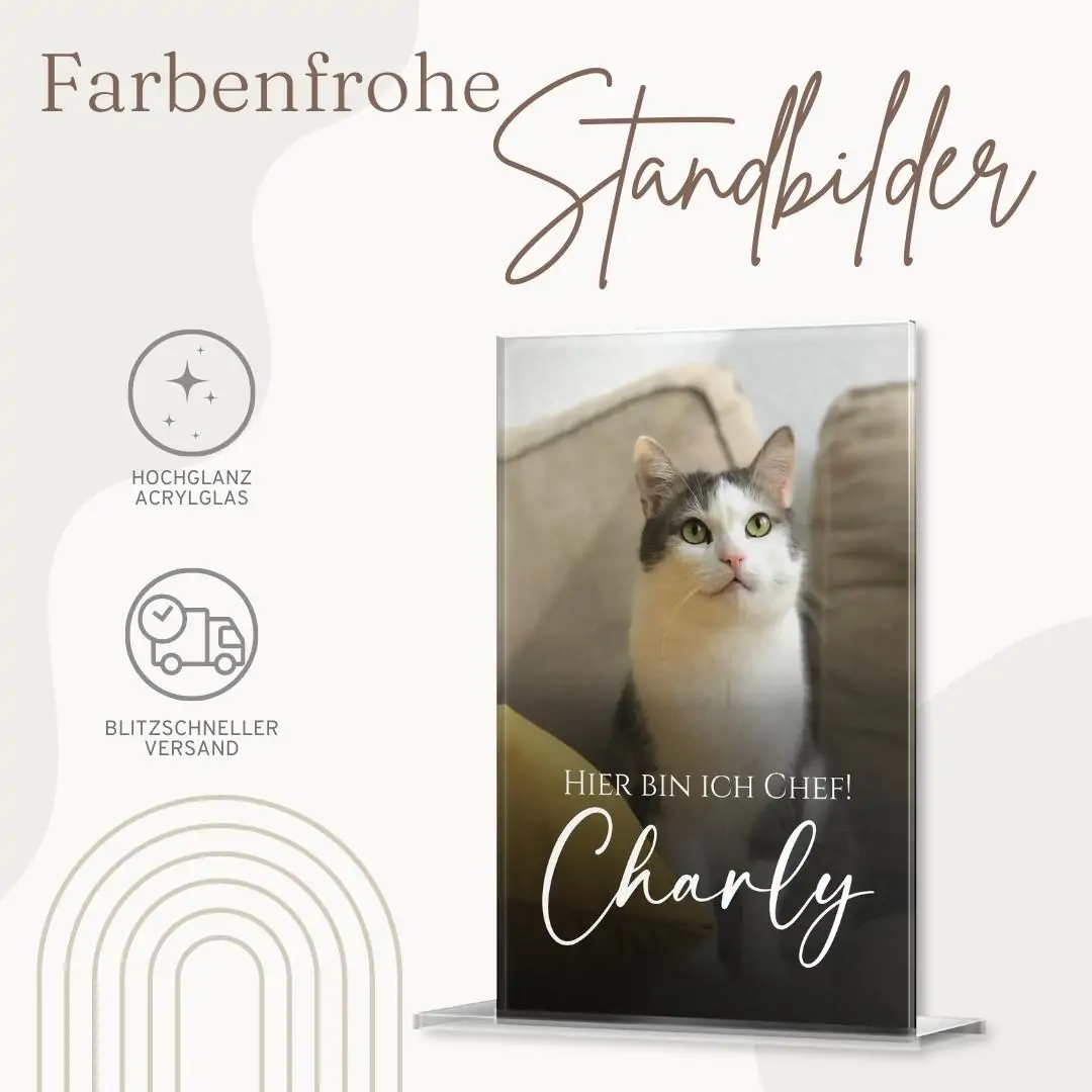 Mache Dir selbst oder Deinen Liebsten mit unseren umwerfenden Standbildern aus Hochglanz Acrylglas eine unvergleichliche Freude. Halte einen einmaligen Augenblick, eine besondere Freundschaft oder die Liebe zu Deinem tierischen Freund mit unseren individuell designbaren Bildern zum Aufstellen fest. Der kratzfeste und langlebige Fotodruck kann wahlweise mit einem persönlichen Schriftzug oder einem hübschen Motiv zusätzlich veredelt werden. Dein personalisiertes Standbild wird inklusive Standfuß in klarer Acrylglas Optik geliefert. Lasse Dich auch im Dunklen von dem einmaligen Design faszinieren, indem Du hinter dem Bild eine Kerze anzündest, so dass es im romantischen Kerzenschein leuchtet.