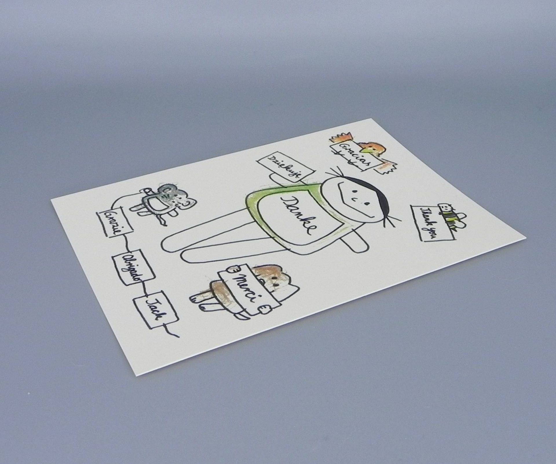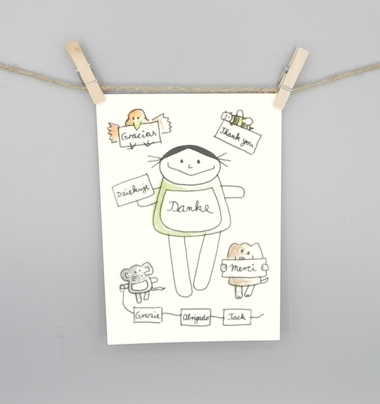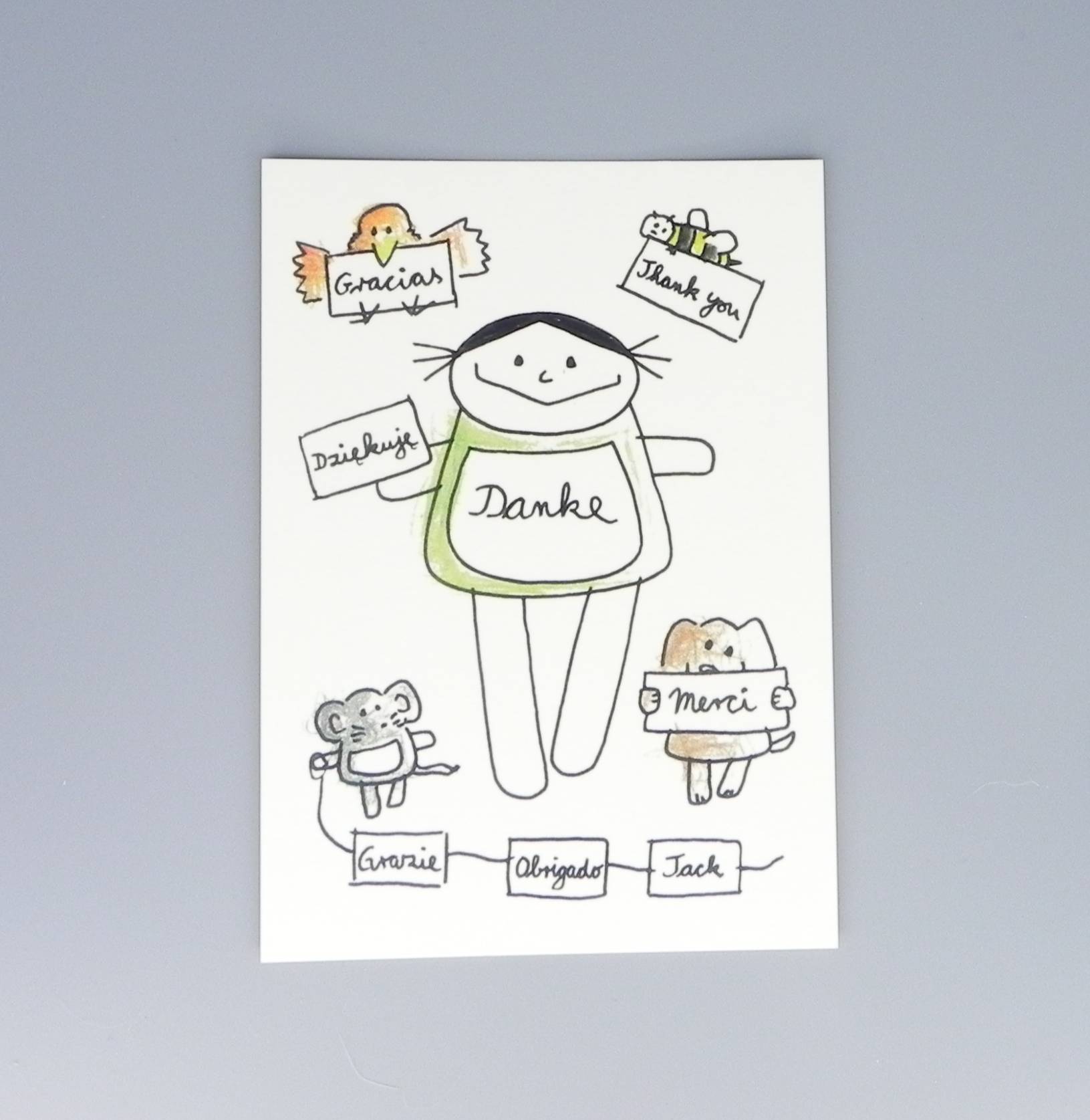 Grußkarte mit nini san Mädchen, Vogel, Biene, Hund und Maus. Alle halten Dankeschilder in verschiedenen Sprachen: