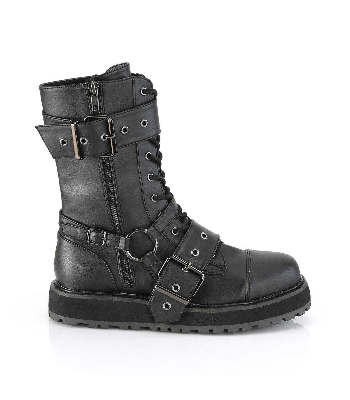Schwarze Stiefeletten von Demonia mit leichtem Plateau-Absatz, Schnallen und einem seitlichen O-Ring.