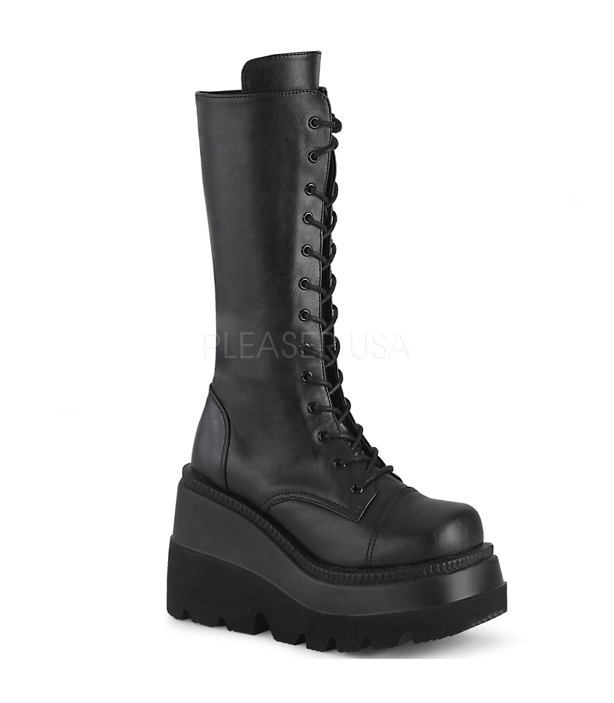 Schlichter schwarzer Schnürstiefel von DemoniaCult mit etwa kniehoher Schnürung vorn und seitlichem Reißverschluss innen.