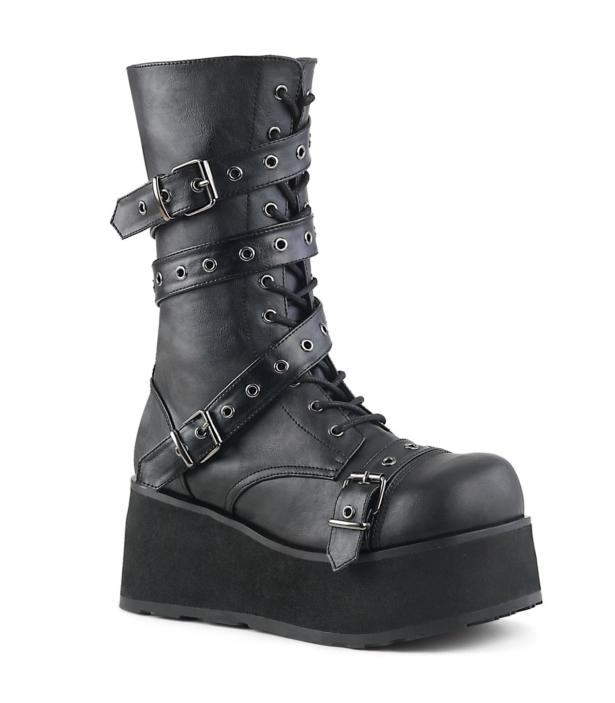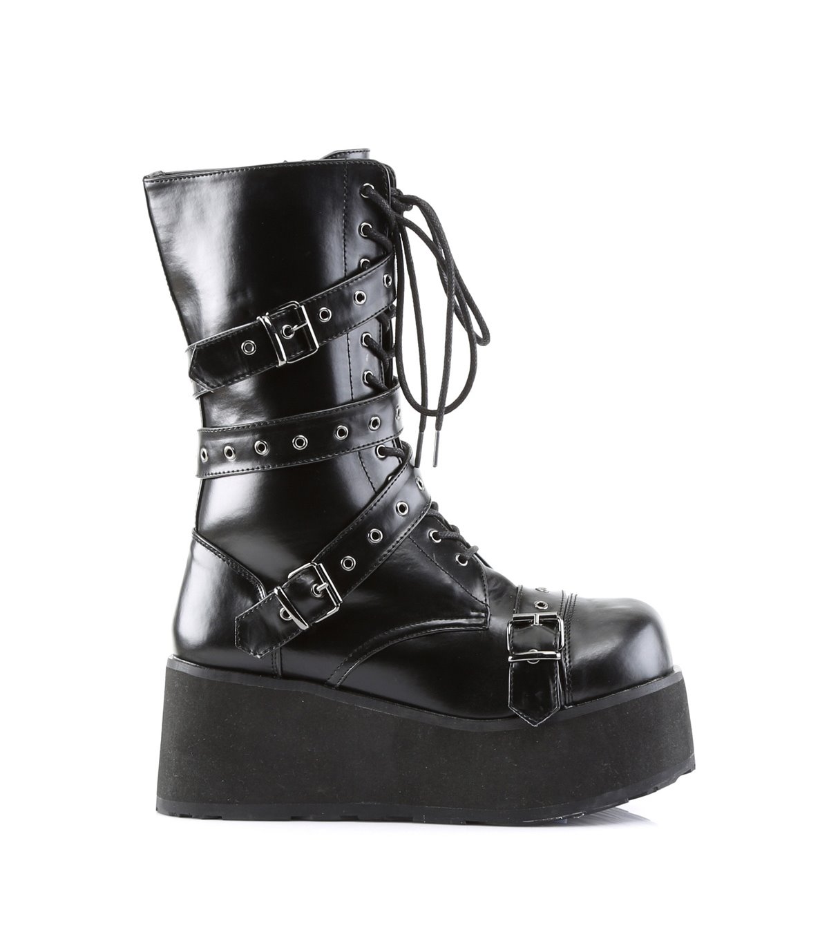 Schwarze Stiefel von DemoniaCult mit hoher Schnürung und einem Riemen mit Schnalle, der um den Schaft gewickelt ist.