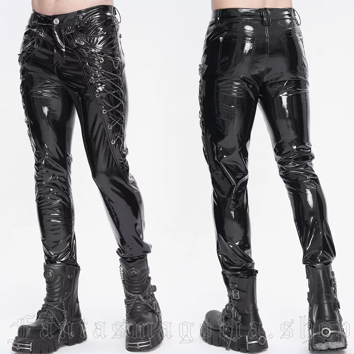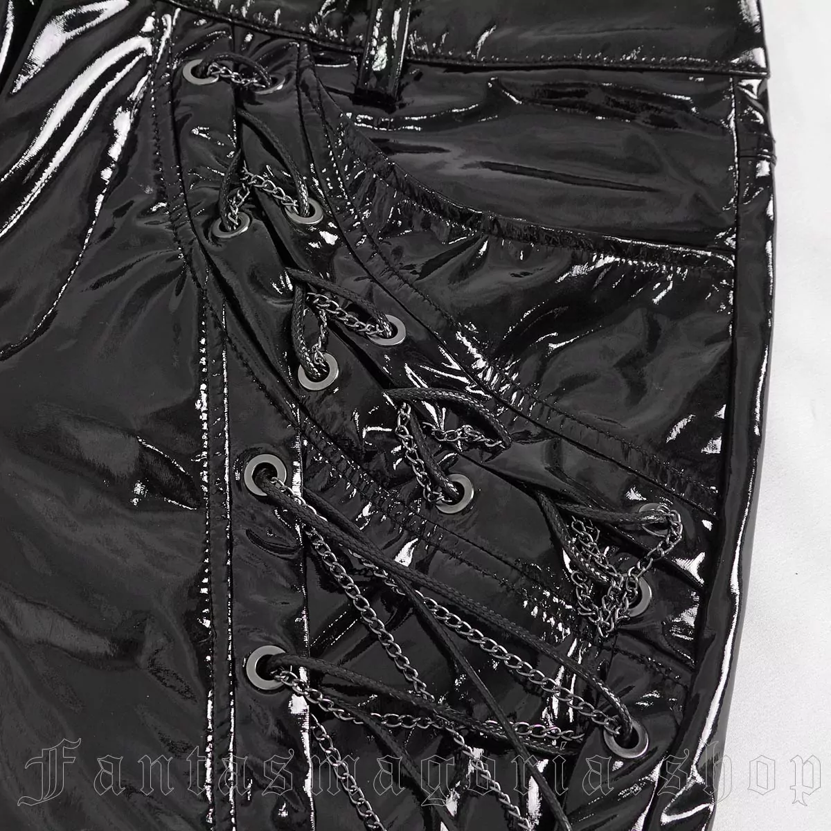 Schwarze Hose von Devil Fashion aus glänzendem Lack mit seitlichen Schnürungen an den Außenseiten der Oberschenkel.