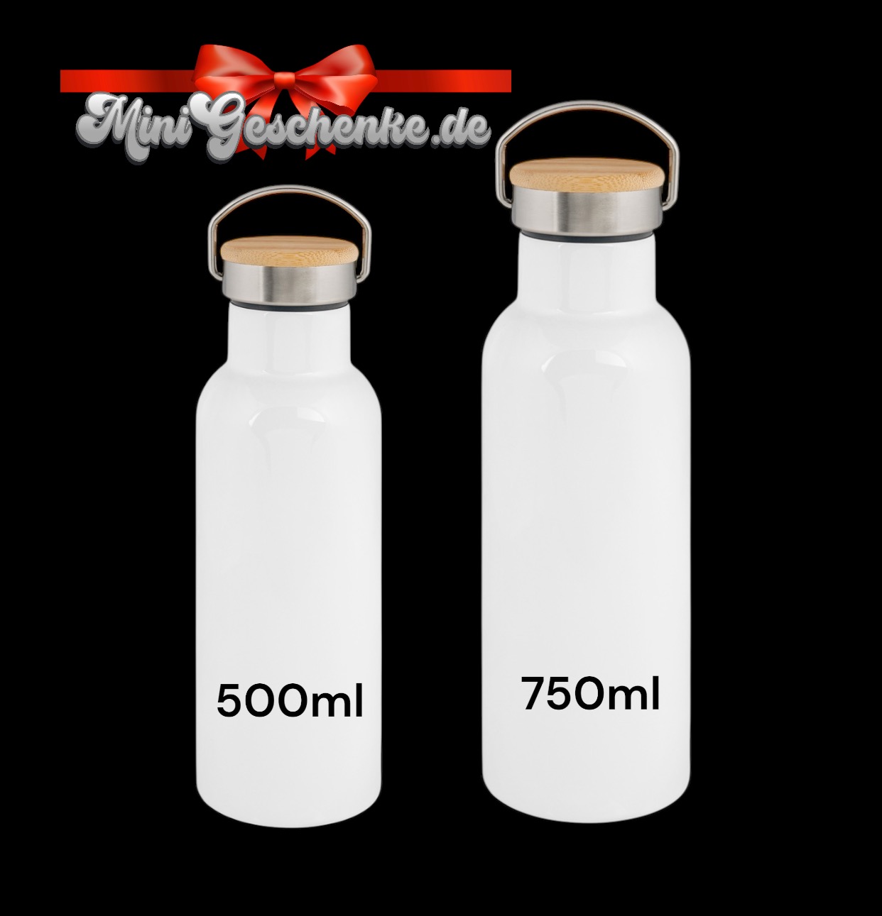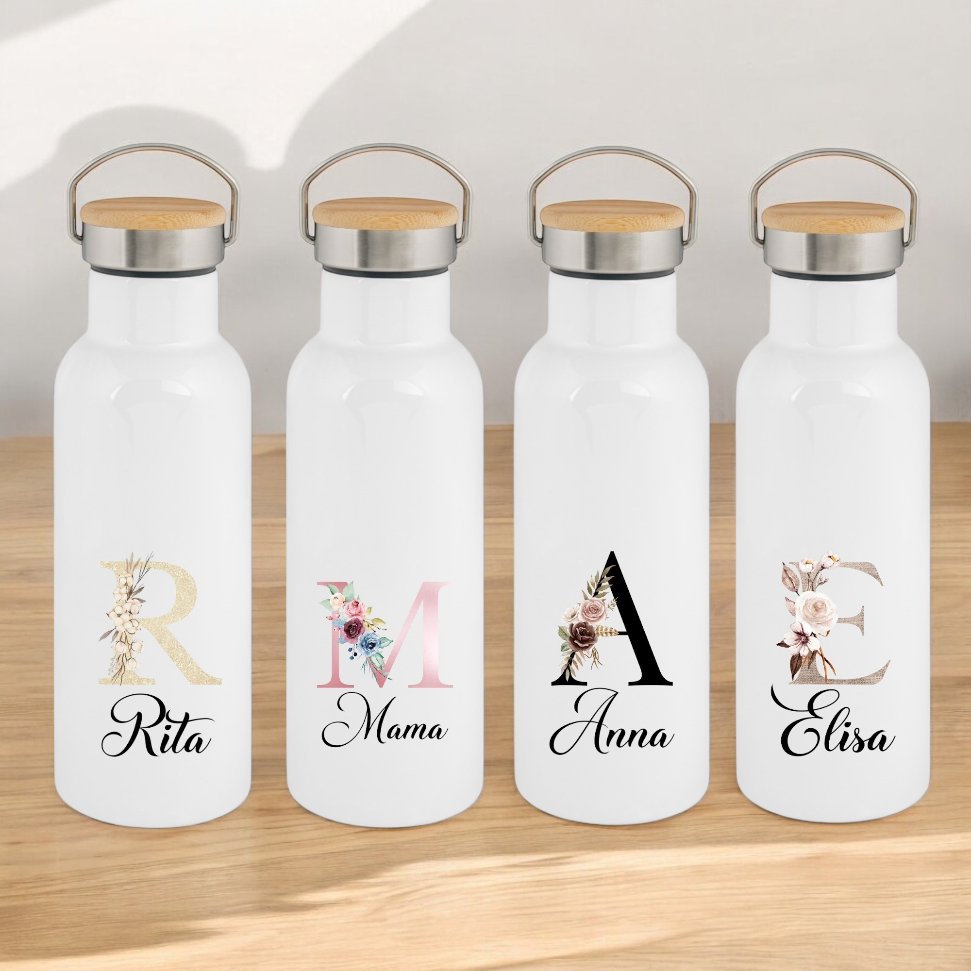 Edelstahl Trinkflasche mit Bambusdeckel personalisiert „Name und Anfangsbuchstabe“ – Thermoflasche Isolierflasche