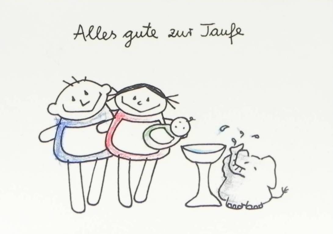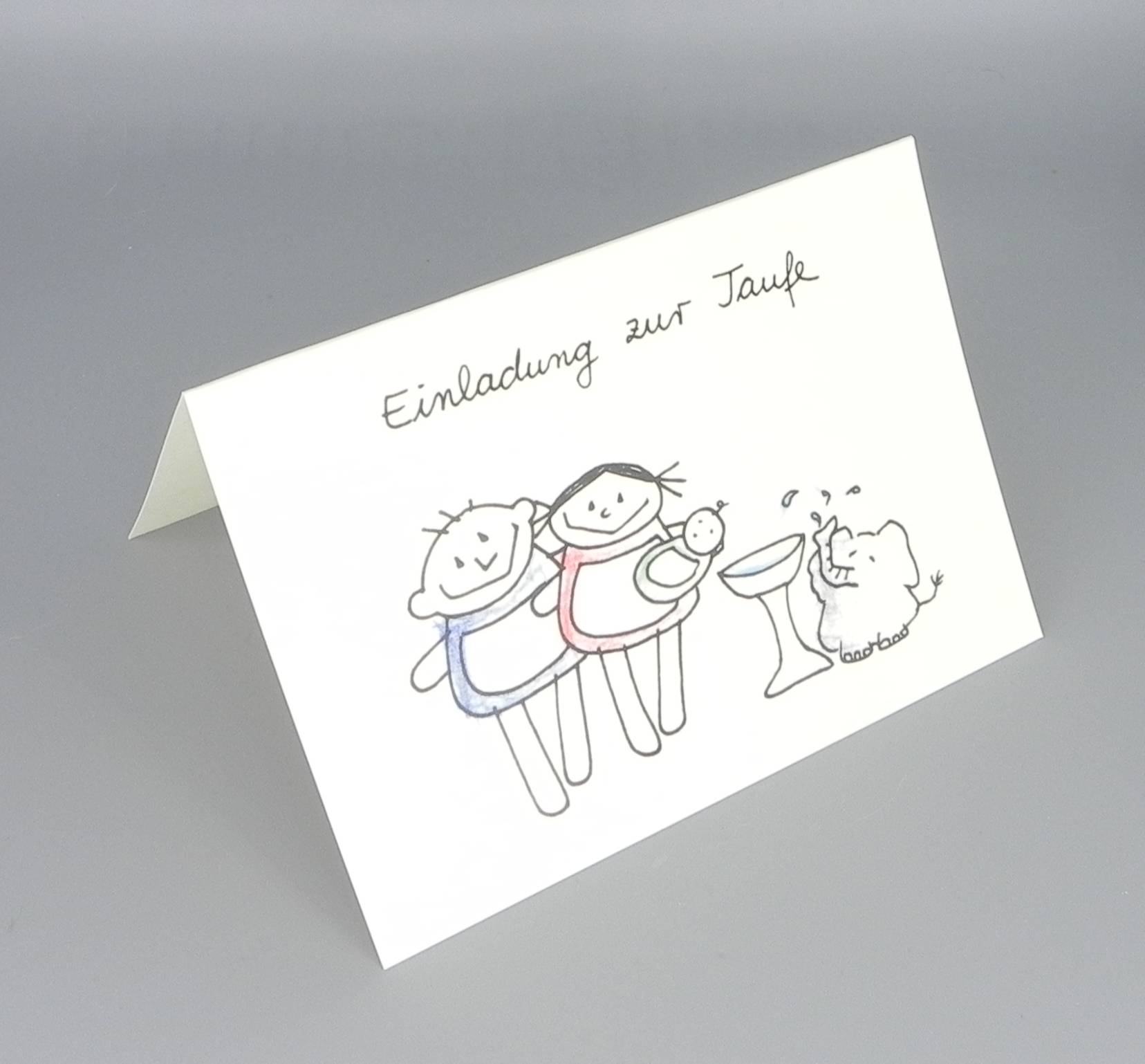 „Einladung zur Taufe“ nini san Klappkarte zur Taufe mit nini san Mädel und Junge und Baby neben Taufbecken und Elefant.