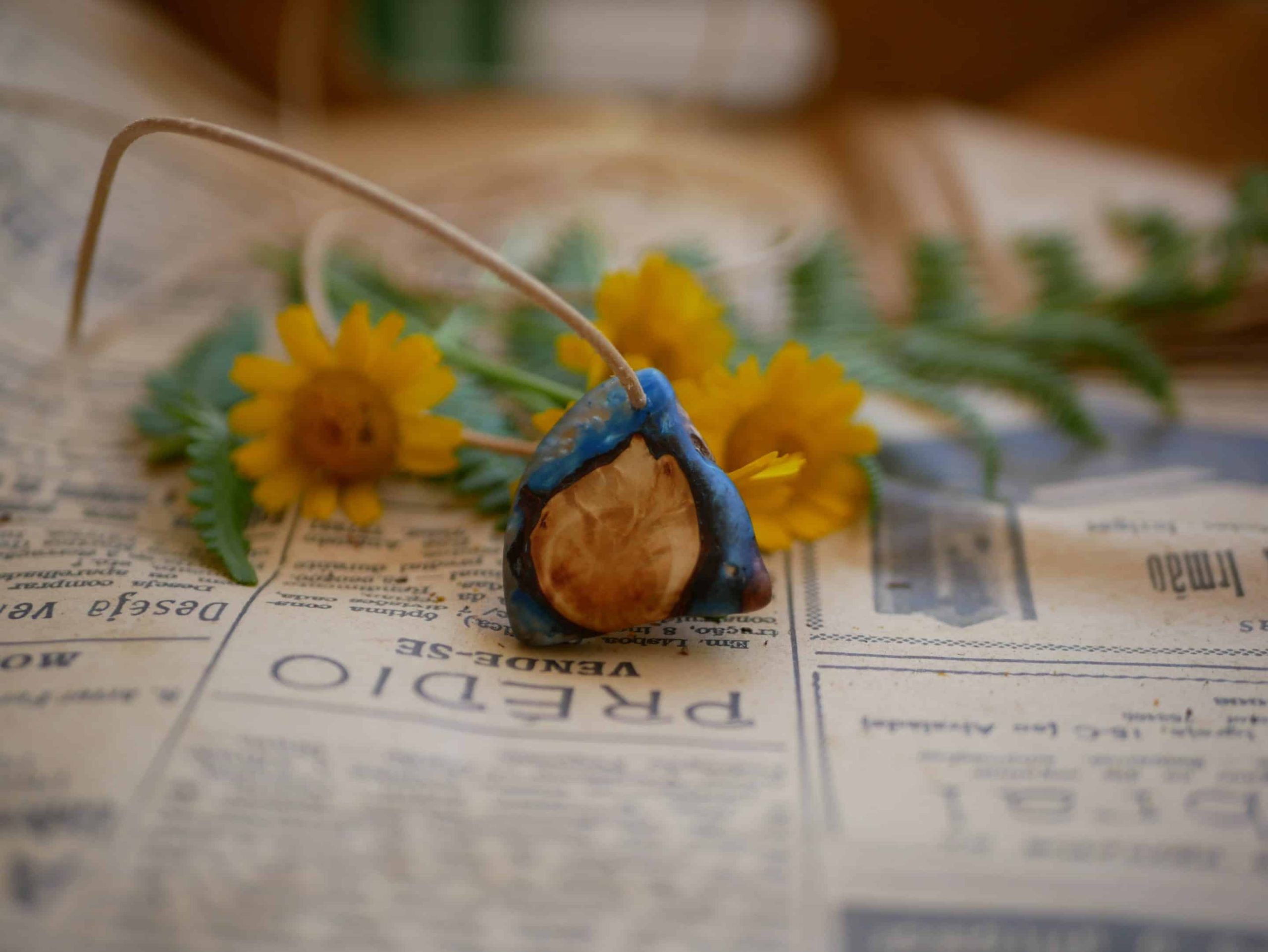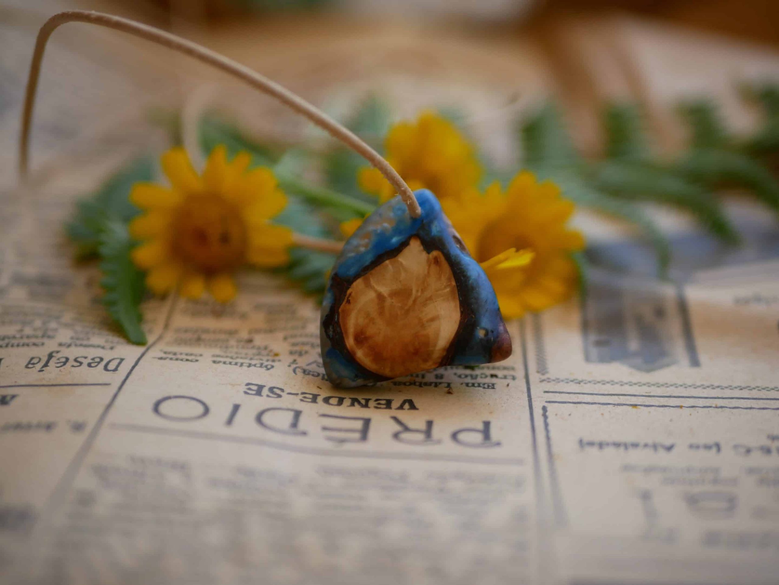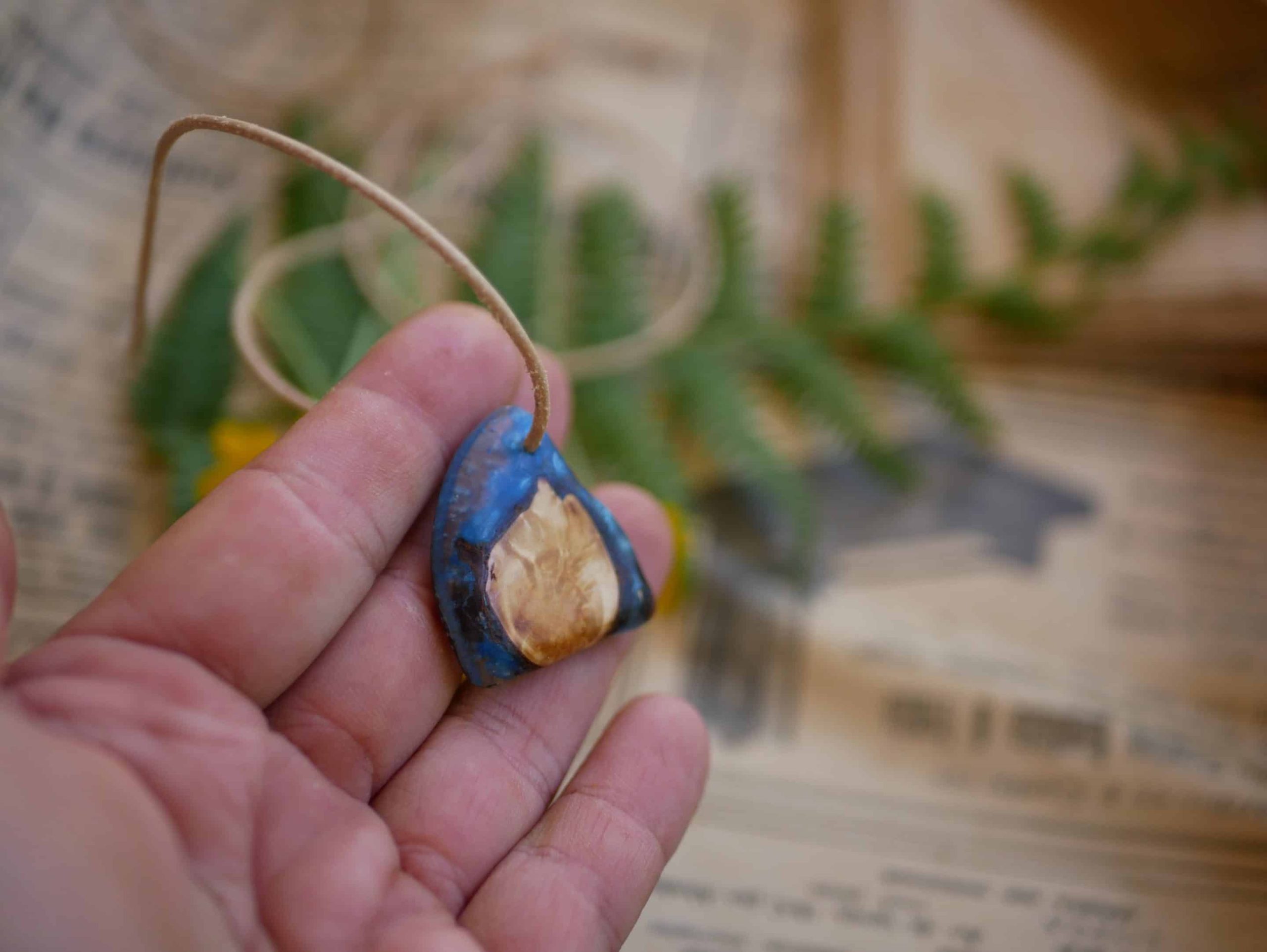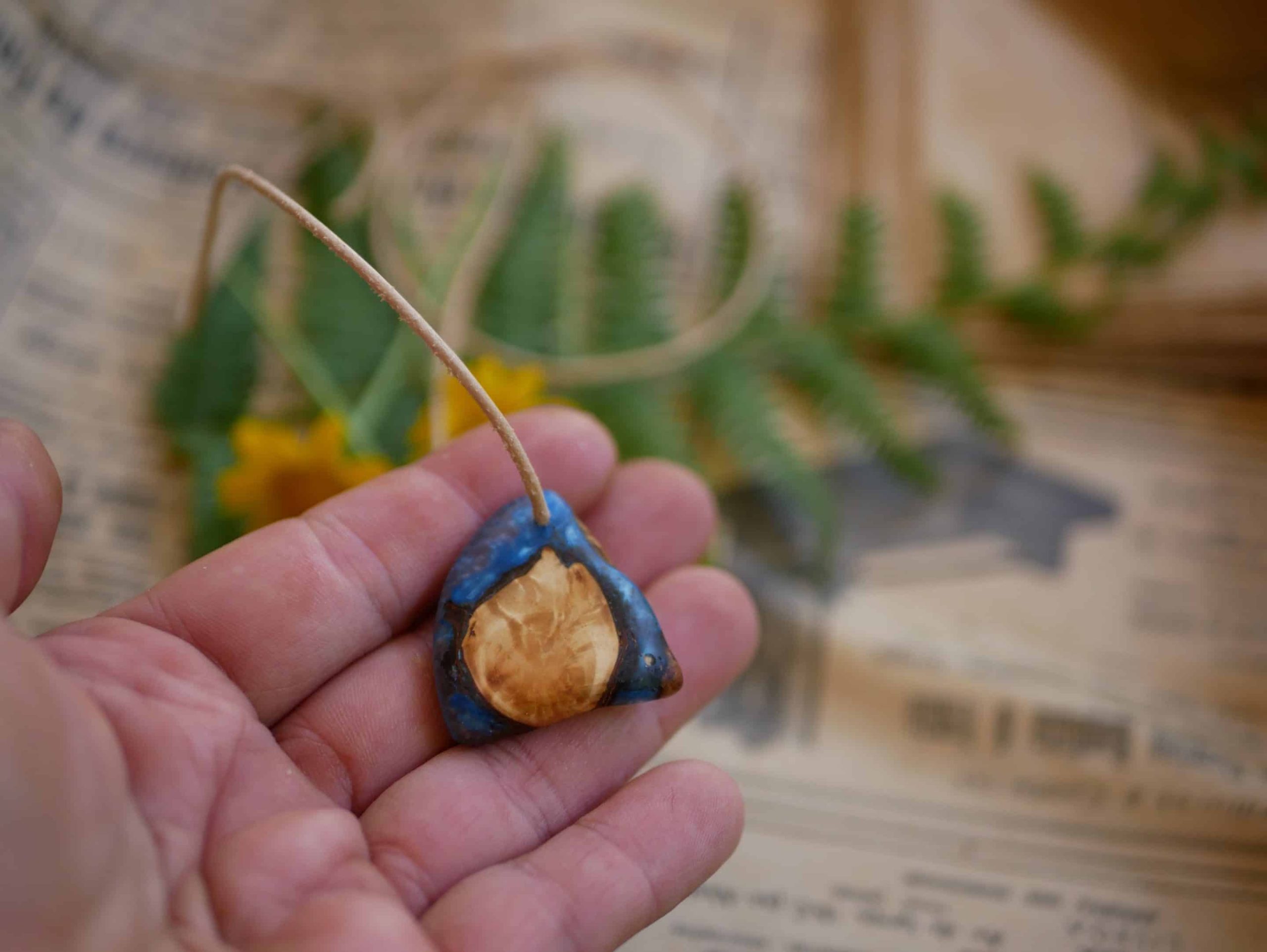 Baumperlenkette mit Epoxidharz und blauer Farbe.