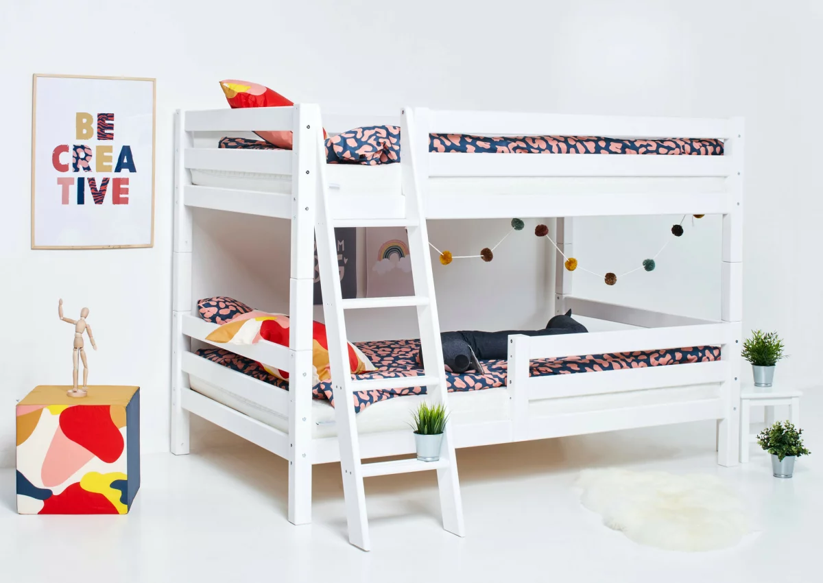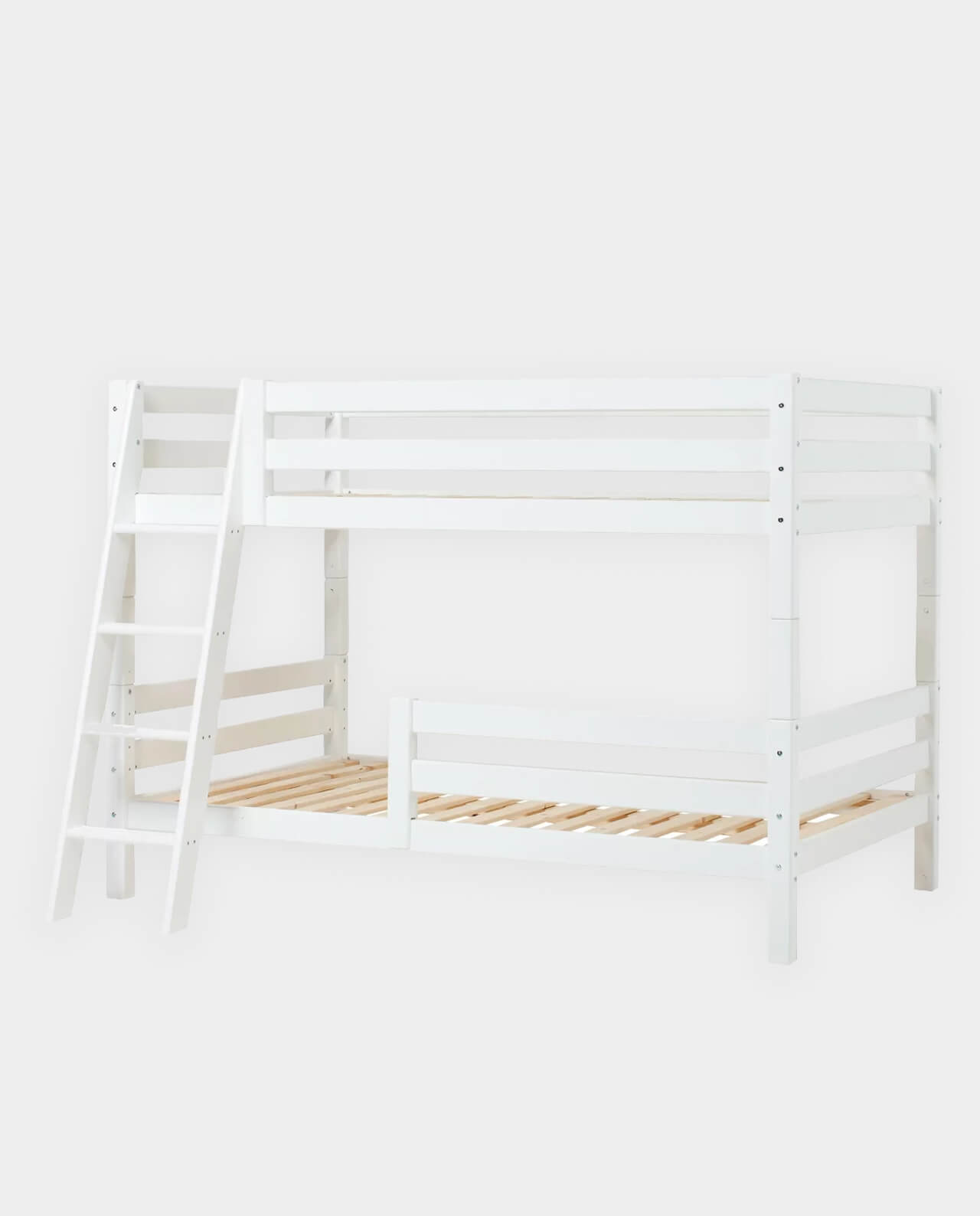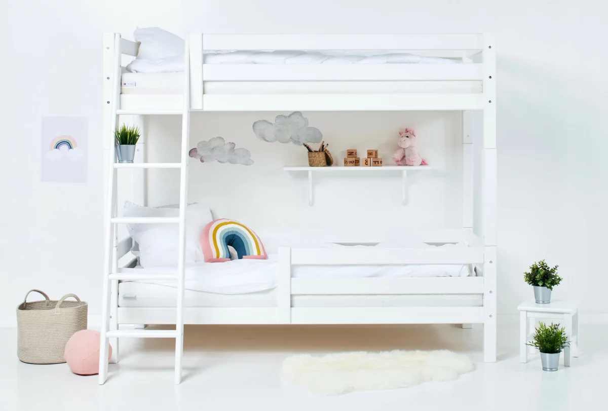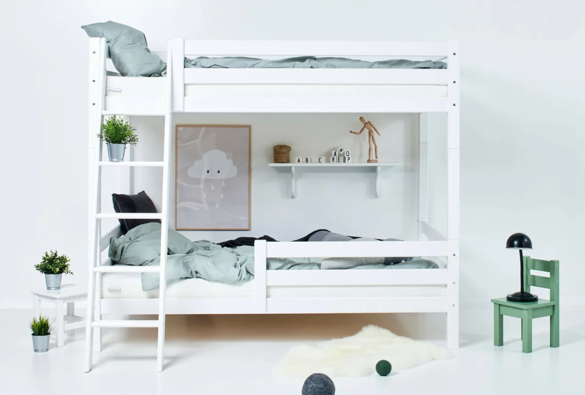 Das HOPPEKIDS ECO LUXURY Etagenbett in den Größen 90×200 cm oder 120×200 cm mit schräger Leiter und Rausfallschutz ist ein Kinderbett für Zwei. Es wird aus massiver nordischer Kiefer gefertigt und ist mit dem Nordischen Umweltzeichen ausgezeichnet. Die Höhe unter dem Bett beträgt 20cm. Der Abstand zwischen dem unteren Bett und dem oberen Bett beträgt 78,5 cm (bei Gesamthöhe 150cm) und 134,5 cm (bei Gesamthöhe 177cm). Die Leiter kann sowohl auf der linken als auch an der rechten Frontseite des Bettes angebracht werden. HOPPEKIDS ECO LUXURY ist ein flexibles und langlebiges Etagenbett mit höchstem Komfort und größtmöglichem Augenmerk auf die Sicherheit. Dazu kommt die Stabilität und die lange Haltbarkeit sowie die breite Palette an Modulen und Zubehör. Das Bett ist modular umbaubar und kann beispielsweise in zwei einzelne Kinderbetten verwandelt werden. So wächst das Bett mit den Anforderungen und Bedürfnissen des Kindes verlängern den Lebenszyklus des Produktes. Der Rausfallschutz kann jederzeit abmontiert werden. Lattenroste sind bereits in der Lieferung inklusive. Matratzen sind nicht inklusive. Dekorationen sind nicht Teil der Lieferung.