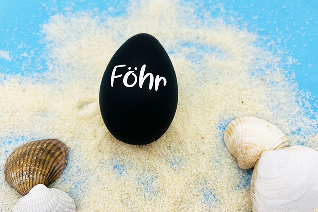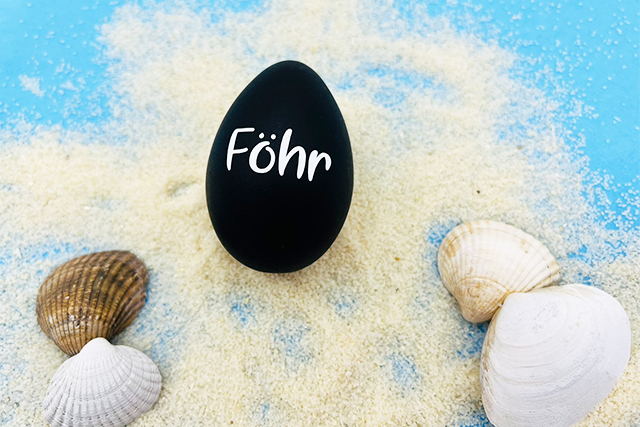 Du kannst das Föhr-Ei hinlegen – es ist nicht zum Aufhängen, ins Osternest legen, zum Suchen verstecken oder auch ein maritimes Osterfest gestalten. Das Ei zeigt von einer Seite den Inselnamen Föhr.