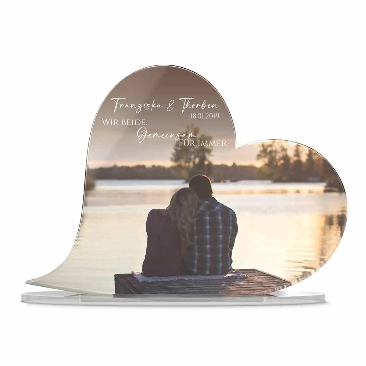 Verewige einen unvergesslichen Moment, einen besonderen Menschen oder einen geliebten Vierbeiner auf unseren bildschönen Standherzen aus hochwertigem Hochglanz Acrylglas. Bei uns kannst Du ein einzigartiges Erinnerungsstück für Dein Wohnzimmer, den Arbeitsplatz oder jeden anderen Ort Deiner Wahl ganz nach Deinen individuellen Vorstellungen erstellen. Fülle das Herz mit Leben, indem Du entweder eine Wunschfarbe auswählst oder ein persönliches Foto als Hintergrund einfügst. Anschließend kannst Du es nach Deinem Belieben mit einer persönlichen Widmung oder einem unserer unzähligen Motive verzieren. Deiner Kreativität sind keine Grenzen gesetzt. Das Herz liegt leicht geneigt auf der Seite, wodurch es bei Lichteinstrahlung eine hübsche Spiegelung aufweist. Auch im Dunkeln kannst Du dich von Deinem Standherz begeistern lassen, indem Du dahinter eine Kerze anzündest, welche das Dekoherz im gemütlichen Kerzenschein leuchten lässt.