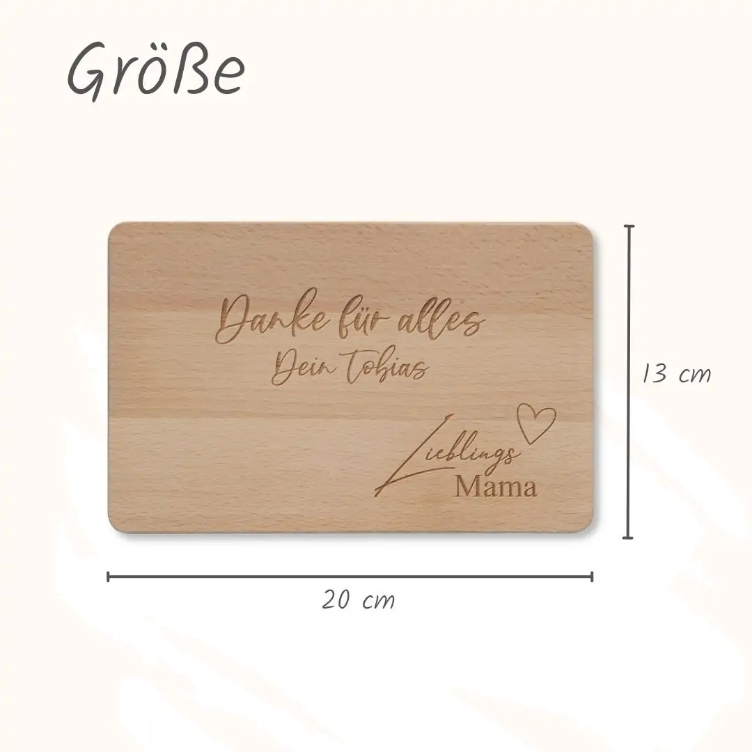 Unser Holzbrettchen eignet sich hervorragend als Geschenk für den Muttertag oder den Geburtstag deiner Mama. Deine Mama wird sich bei jedem Frühstück an dich erinnern und sich über das praktische und stilvolle Geschenk freuen.