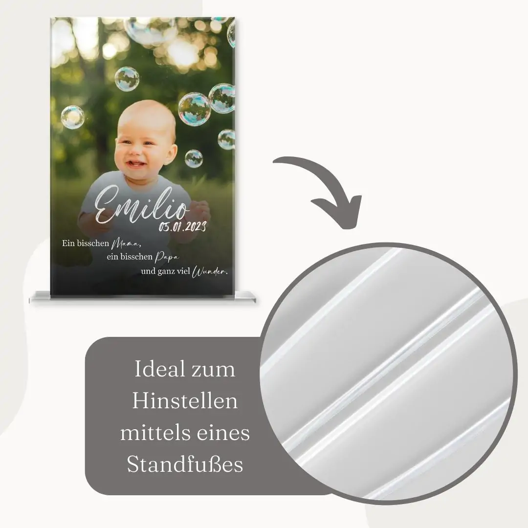 Alle unsere Standbilder werden in der hauseigenen Produktionsstätte zugeschnitten und mittels hochwertigen UV Drucks rückseitig bedruckt. Gegenüber dem Foliendruck überzeugt unser Druck mit seiner überdurchschnittlichen Haltbarkeit und ist absolut kratzfest. Damit eignet sich der Dekoartikel sogar für den Außenbereich. Bitte beachte, dass sich die Ränder minimal (bis zu 1,5 mm) verschieben können, da beim UV Druck ein Sicherheitsabstand eingehalten werden muss. Das elegante Standbild wird inklusive Stand Fuß geliefert und kann dank des simplen Einstecksystems beliebig aus der Halterung genommen und wieder reingesteckt werden. So kannst Du dein liebevoll designtes Unikat beispielsweise bei der nächsten Geburtstagsfeier direkt zum Bestaunen in die Runde geben.