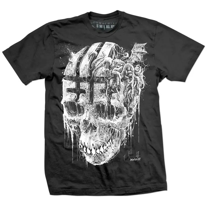 Schwarzes T-Shirt von Godmachine mit weißem Aufdruck auf der Vorderseite, auf dem ein großer Totenkopf zu sehen ist.