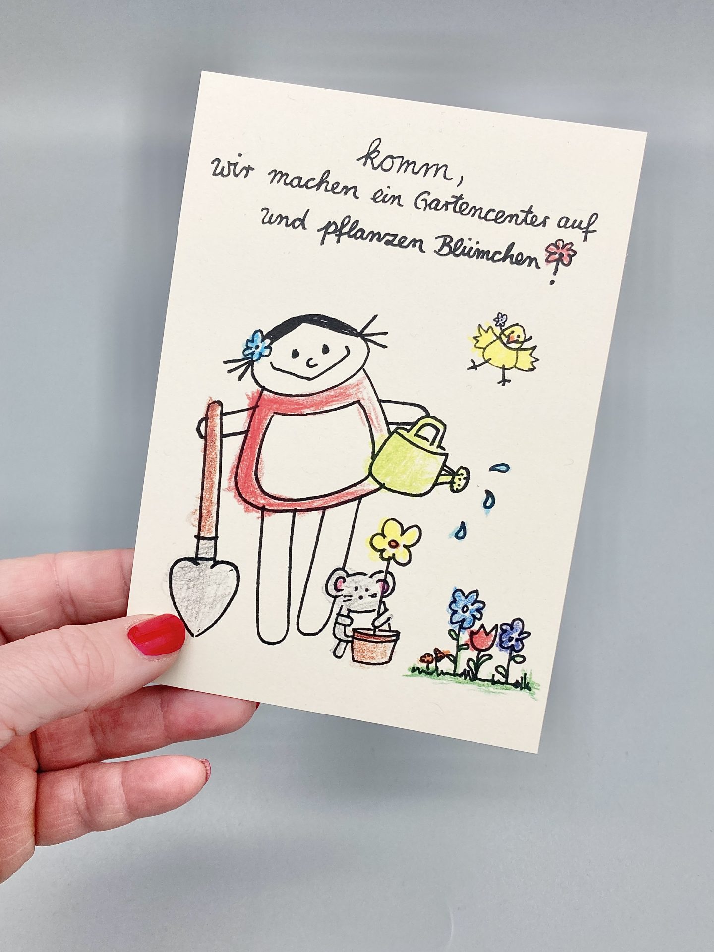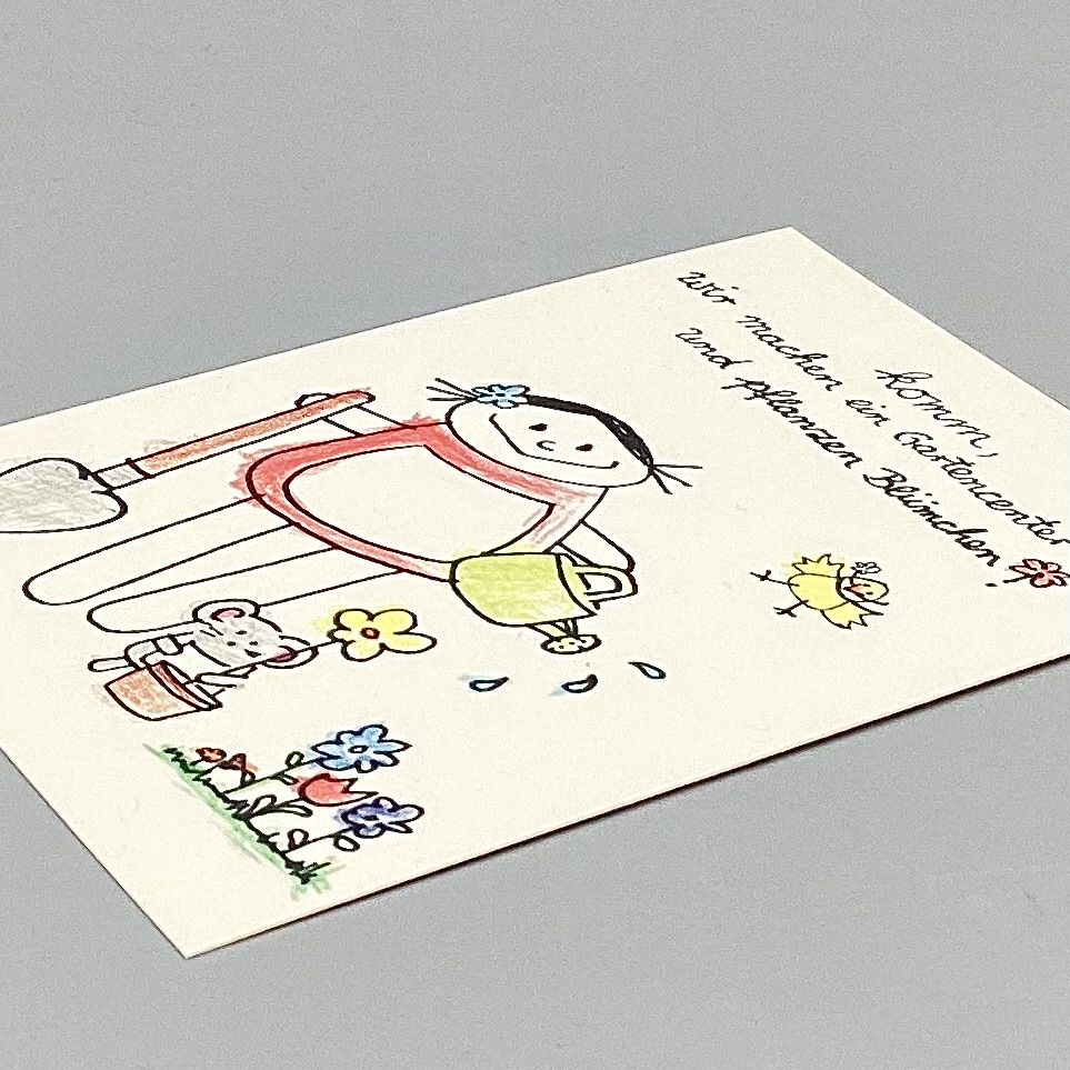 nini san Mädchen in rot mit hellgrüner Gießkanne. Sie hält einen Spaten in der Hand und ist bereit zum Loslegen. Neben ihr eine kleine graue Maus beim Blumeneinpflanzen. Mit kleiner Blumenwiese und gelben Vogel in der Luft.