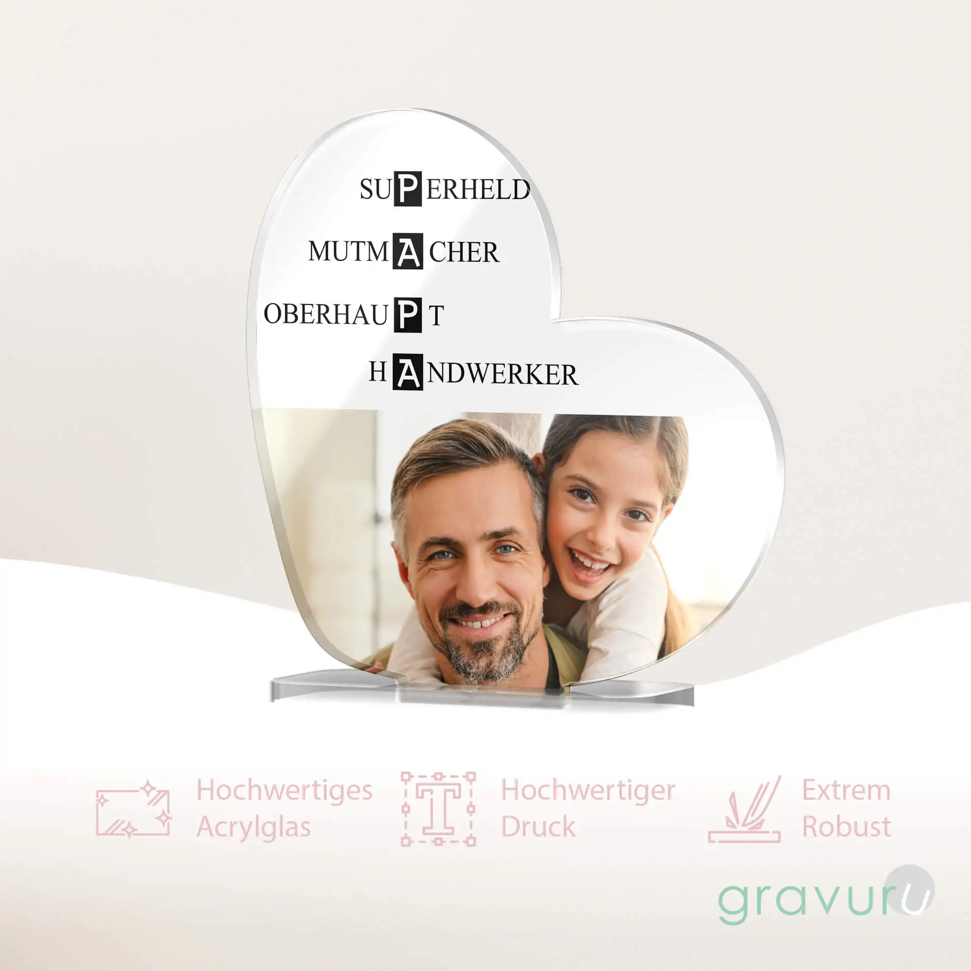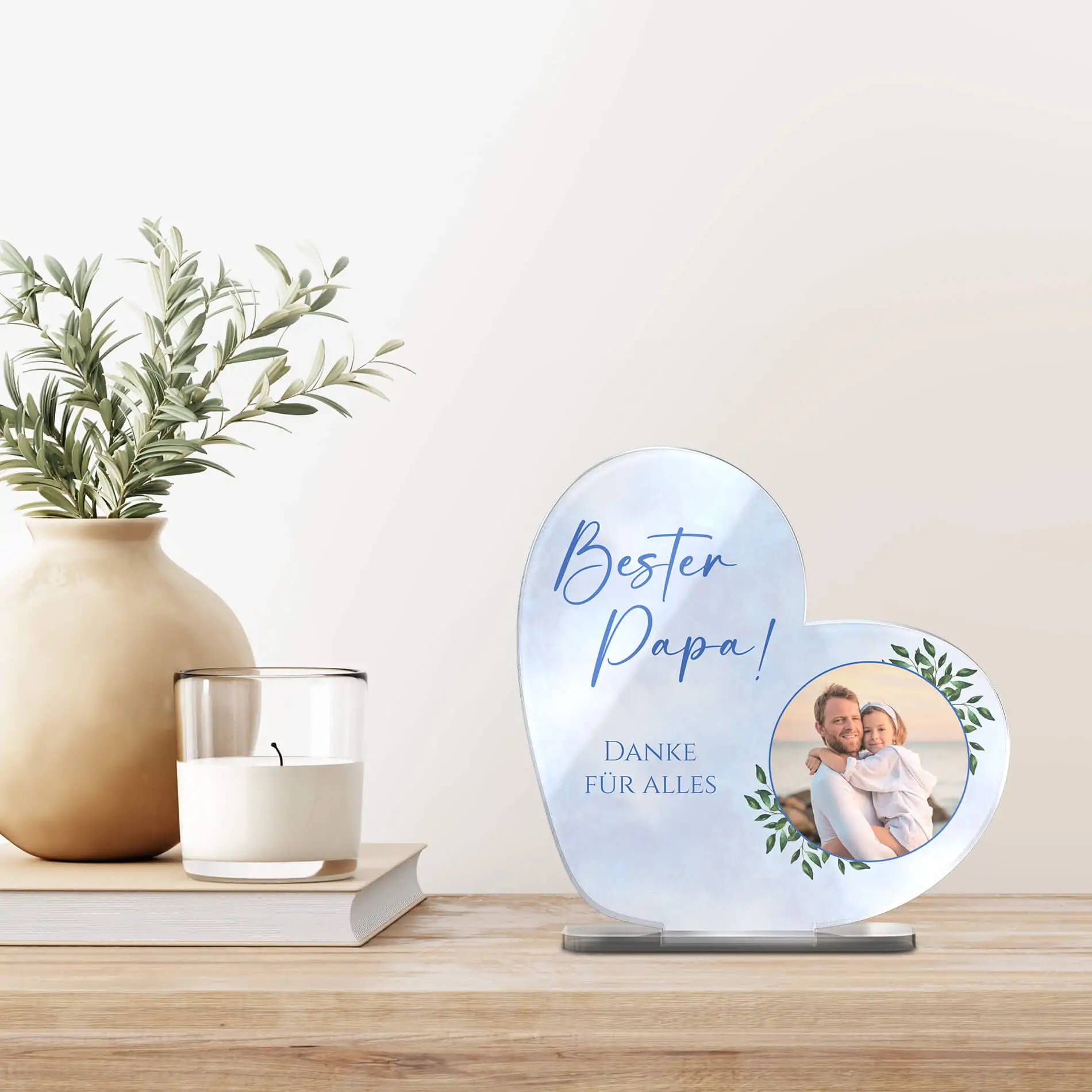 Verewige einen unvergesslichen Moment, einen besonderen Menschen oder einen geliebten Vierbeiner auf unseren schönen Standbildern aus hochwertigem Hochglanz Acrylglas. Bei uns kannst Du ein einzigartiges Erinnerungsstück für Dein Wohnzimmer, den Arbeitsplatz oder jeden anderen Ort Deiner Wahl ganz nach Deinen individuellen Vorstellungen erstellen. Fülle das Standbild mit Leben, indem Du ein Design auswählst und ein persönliches Foto einfügst. Anschließend kannst Du es nach Deinem Belieben mit einer persönlichen Widmung oder einem unserer unzähligen Motive verzieren. Deiner Kreativität sind keine Grenzen gesetzt. Das Bild liegt leicht geneigt auf der Seite, wodurch es bei Lichteinstrahlung eine hübsche Spiegelung aufweist. Auch im Dunkeln kannst Du dich von Deinem Standherz begeistern lassen, indem Du dahinter eine Kerze anzündest, welche das Standbild im gemütlichen Kerzenschein leuchten lässt.