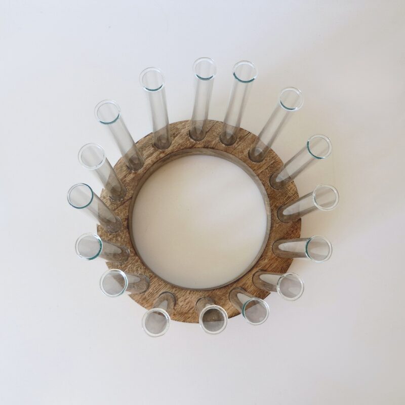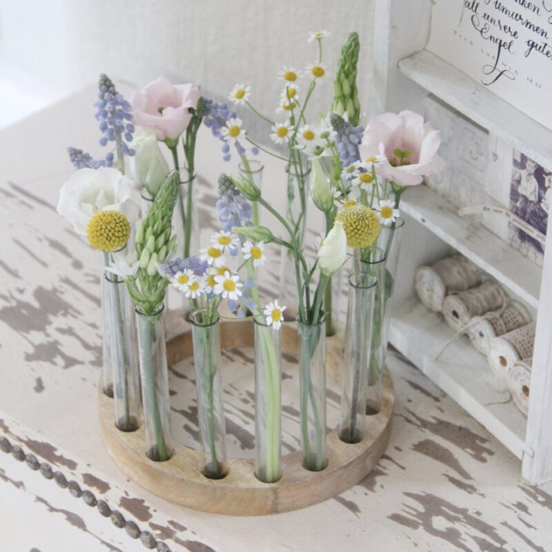 Dieser Blumenkranz ist mal so ganz anders als andere! Der Mix aus dem Naturmaterial Holz in Kombination mit den Reagenzgläsern ist sehr schlicht und wirkt gefüllt mit Gräsern, Frühlingsblühern, Rosen, Bartnelken und vielen anderen Schnittblumen leicht und filigran. Ich bringe ständig Blumen von unseren Gassirunden mit und bei uns im Garten gibt es immer irgendwo etwas, das blüht. So kannst Du auch abgeknickte Blumen noch phantastisch in Szene setzen!