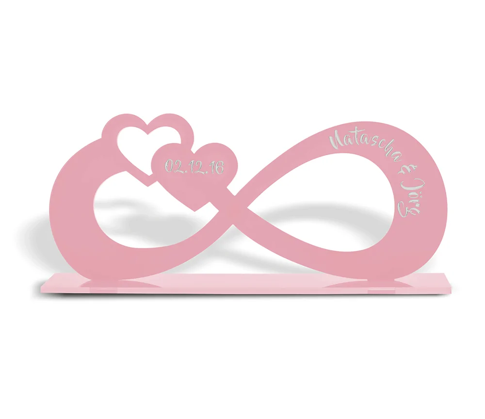 Verzaubere Deinen Partner mit dieser wunderschönen personalisierbaren Infinity Standfigur aus edlem Hochglanz Acrylglas. Bei uns kannst Du Dir ein ganz individuelles Einzelstück für Dein Wohnzimmer, den Hausflur oder das Schlafzimmer fertigen lassen. Wir gravieren die hochwertige Acrylglasplatte in Deiner Wunschfarbe mit euren Namen, dem Datum oder einer anderen persönlichen Widmung. Auch als Zeichen für echte Freundschaft oder als Erinnerungsstück für Deinen Vierbeiner machen sich die Infinity Zeichen mit persönlicher Gravur hervorragend. Tipp: Wenn Du zudem auf der Suche nach einem außergewöhnlichen und personalisierten Geschenk bist, verschenke mit unseren Infinity Figuren unvergessliche Freude. Auch als romantische Geste zum Jahrestag, zur Verlobung oder Hochzeit eignen sie sich perfekt.