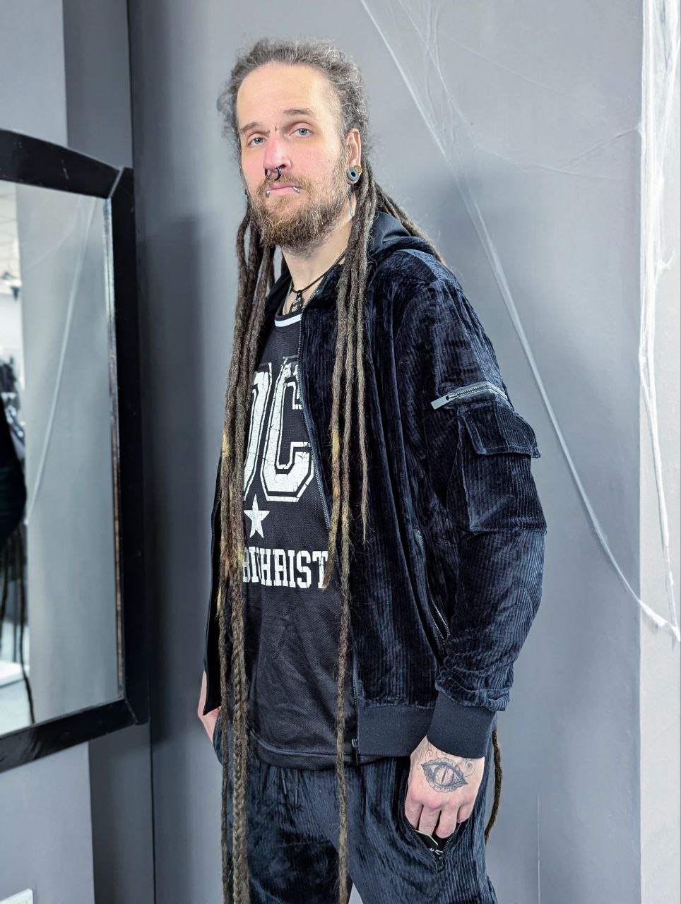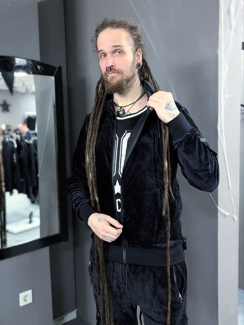 Schwarze Sweatjacke aus weichem Cordstoff mit Reißverschluss in der Mitte, einer Tasche am Ärmel und Kapuze.