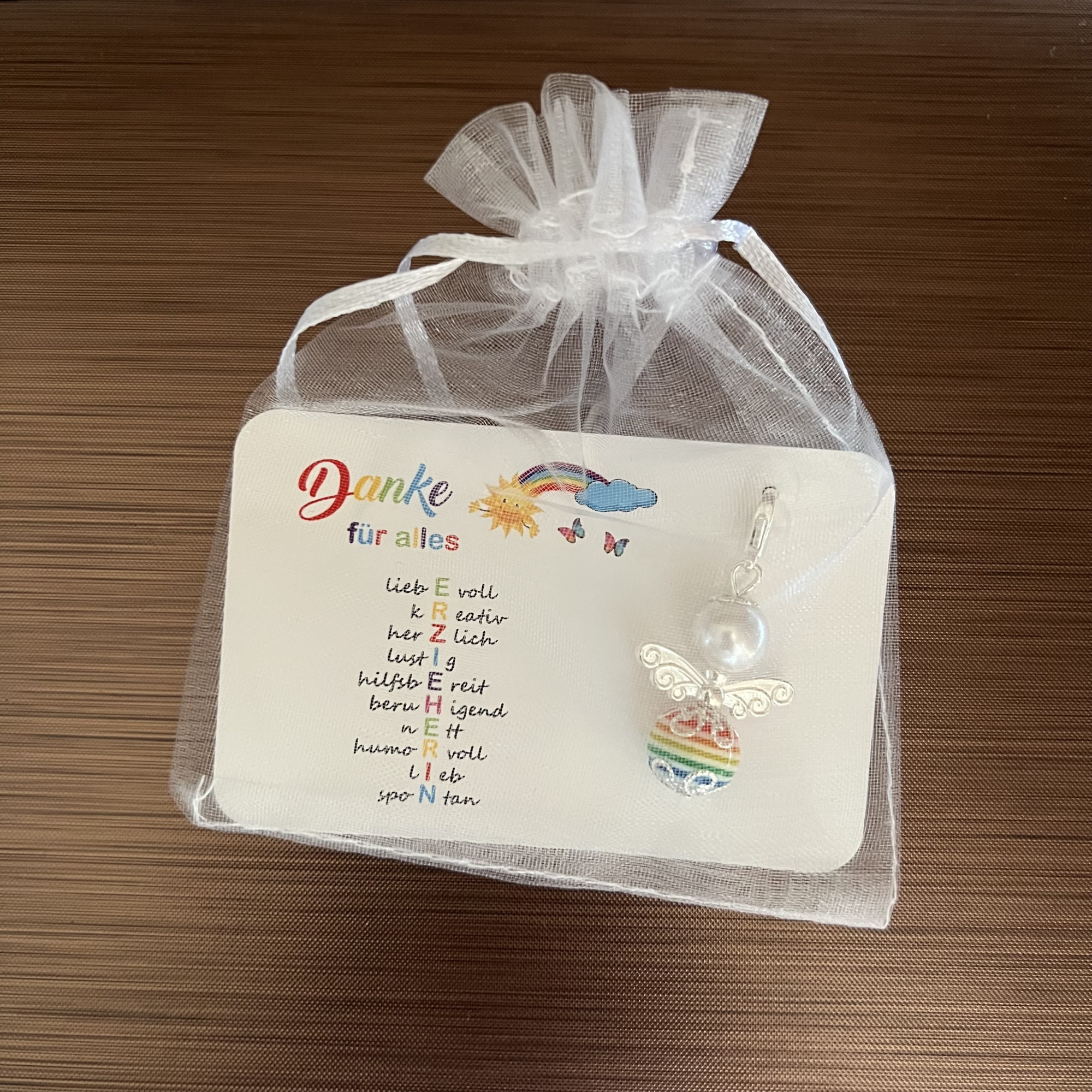Das Ganze wird verschenkfertig in einem Organzasäckchen (siehe Bild 2) verschickt.