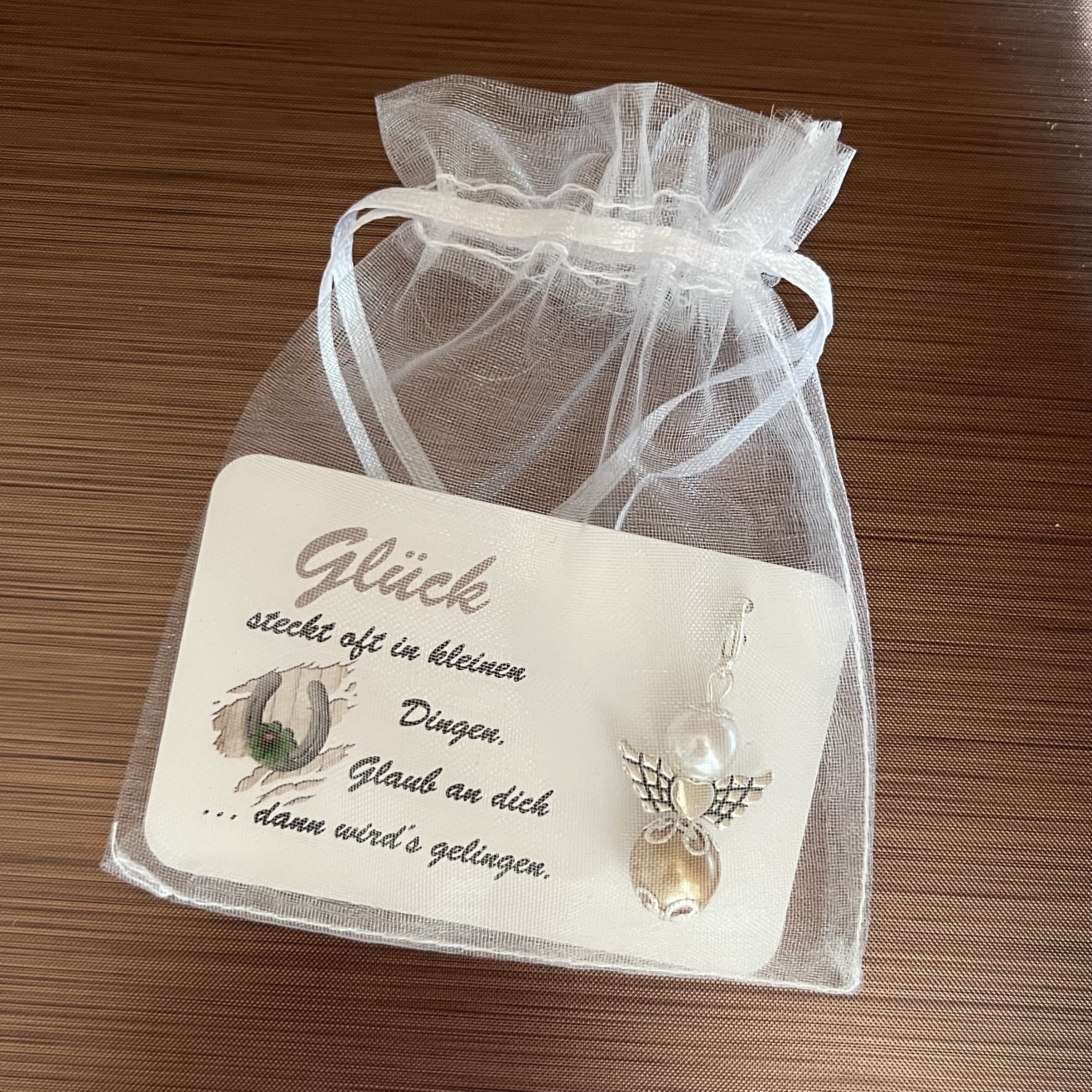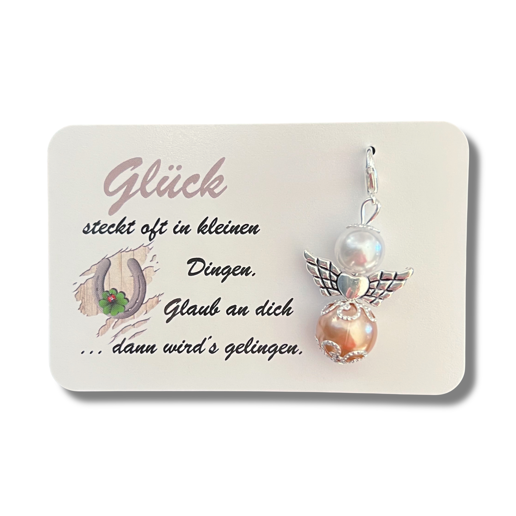 Ein Perlenengel hat mit Karabinerhaken eine Gesamtlänge von ca. 4,5 cm.