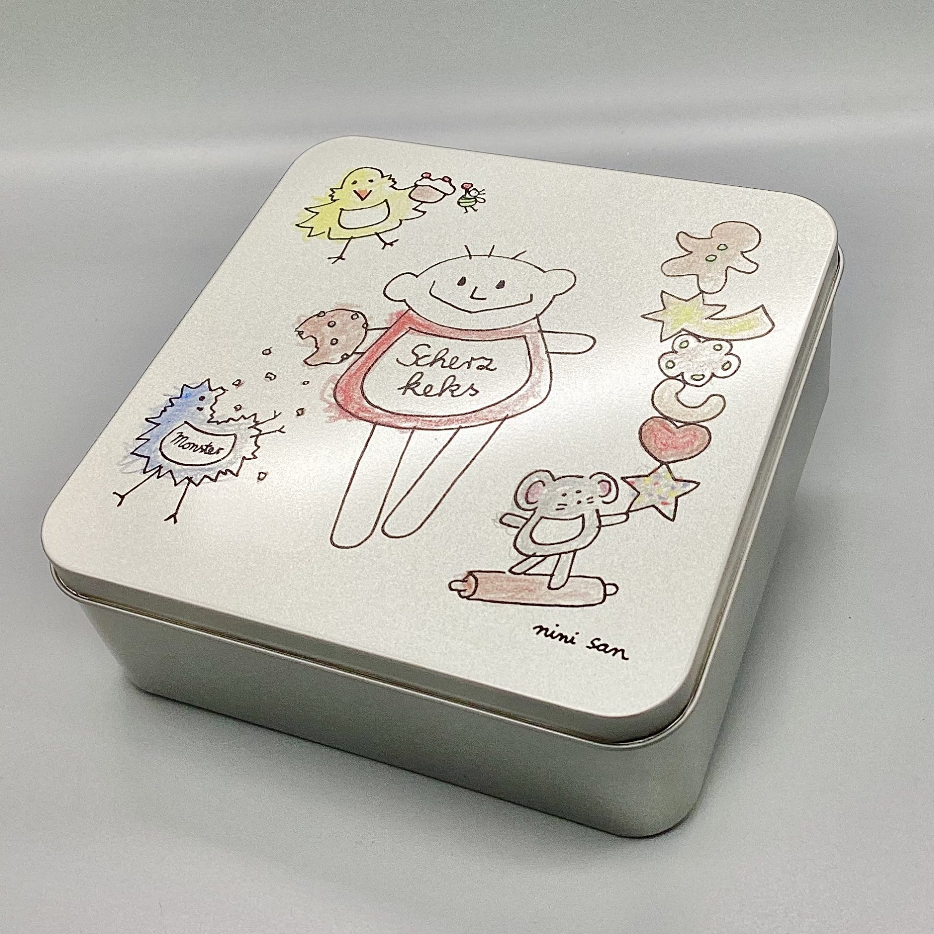 🎈 Metalldose mit nini san Junge in rot. Die männliche Figur hält einen amerikanischen Cookie in der Hand. Die Krümel des Kekses mit Schokoladenstücken werden von einem kleinen blauen Monster aufgefangen und gefressen. Neben dem Bub tanzt eine graue Maus auf einem Nudelholz. Das Mäuschen balanciert einen Stapel Kekse auf ihrer Hand: Sternkeks mit bunten Streusel, Herzkeks mit rotem Zuckerguß, Vanillekipferl, Sandkeks in Blumenform, Sternschnuppe mit Eidotter bestrichen und ein Keksmännchen ganz oben. Über der nini san Figur fliegt ein gelber Vogel mit einem Muffin im Flügel. Ein grüner Marienkäfer klaut eine rote Perle vom Muffin.