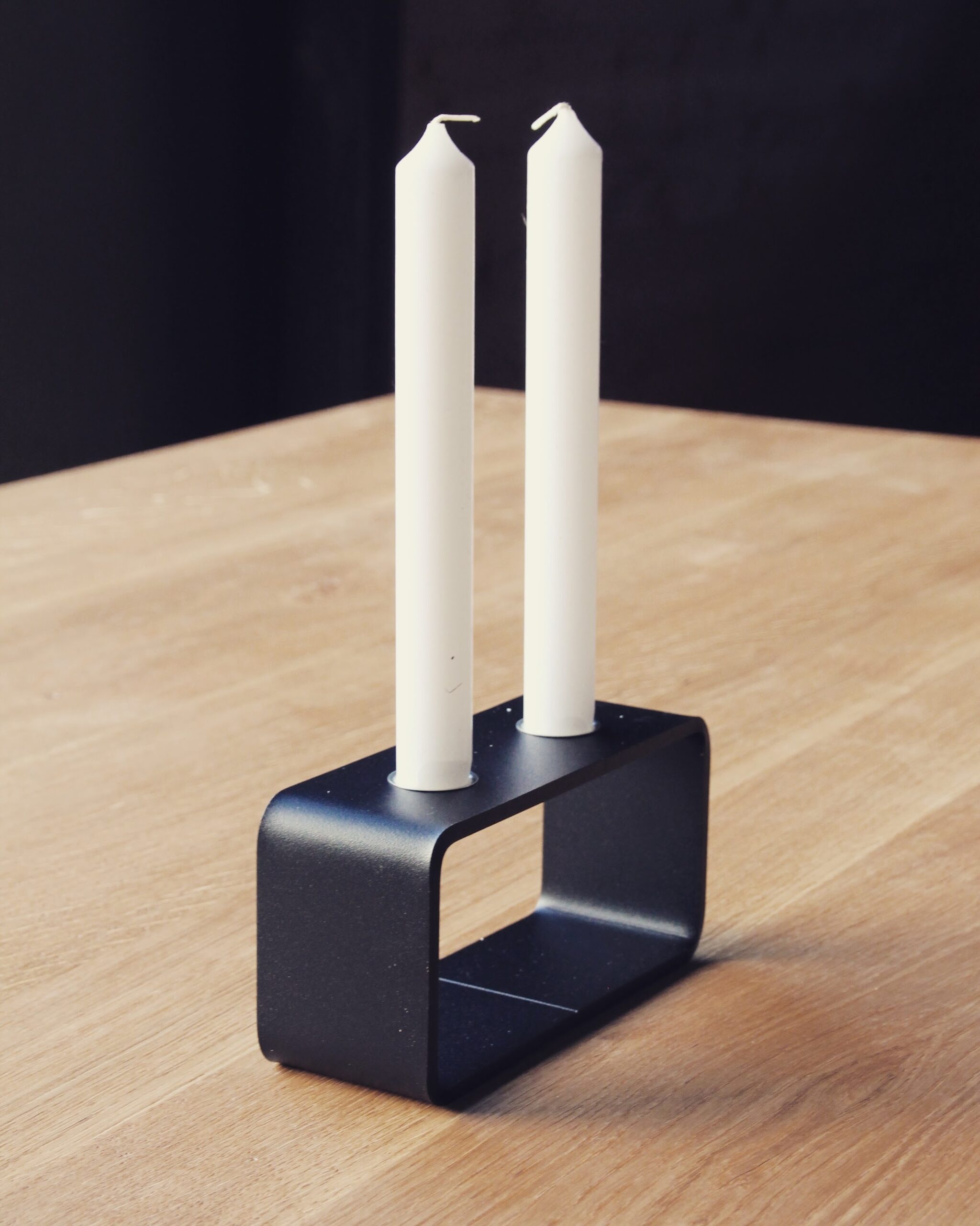 Kerzenständer TWOGLOW vereint ein modernes und schlichtes Design. Der moderne Kerzenständer für zwei lange Kerzen besteht aus massivem Stahl und wiegt 932 g – nicht wenig für einen Kerzenständer. Dafür rutscht er aber auch nicht versehentlich vom Tisch. Der harte Stahl ist pulverbeschichtet in der Farbe Schwarz oder Weiß. Du erhältst mit TWOGLOW einen super stylischen Kerzenständer made in Germany (Hamburg).