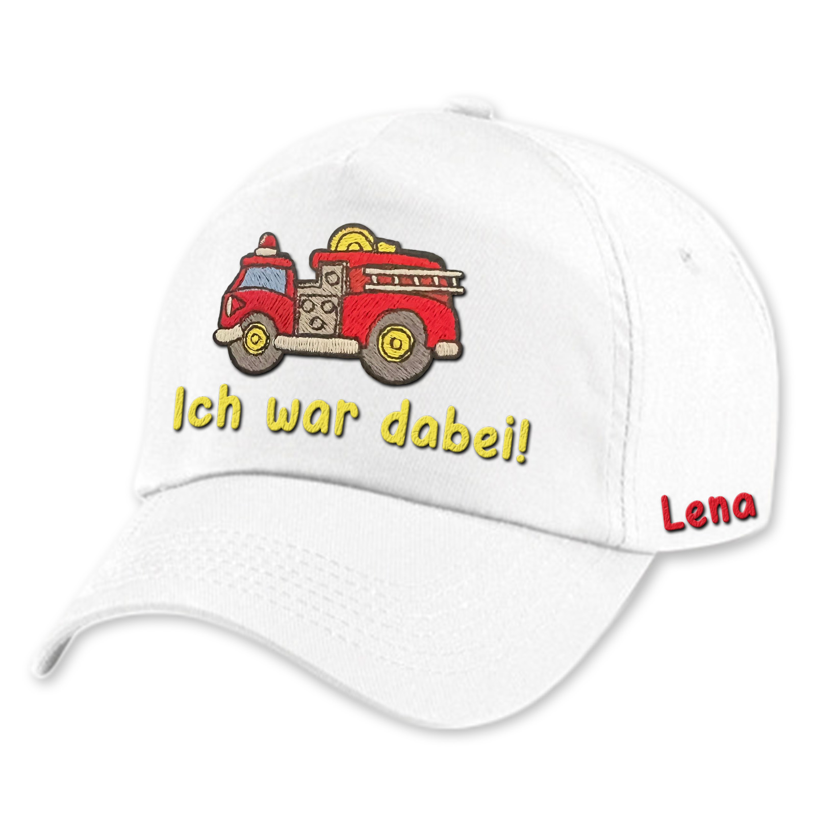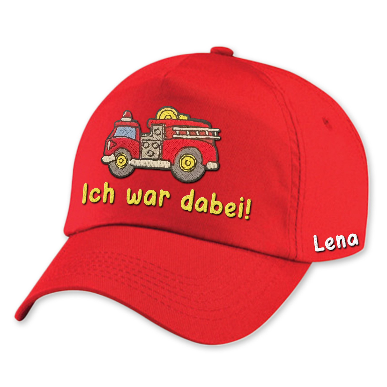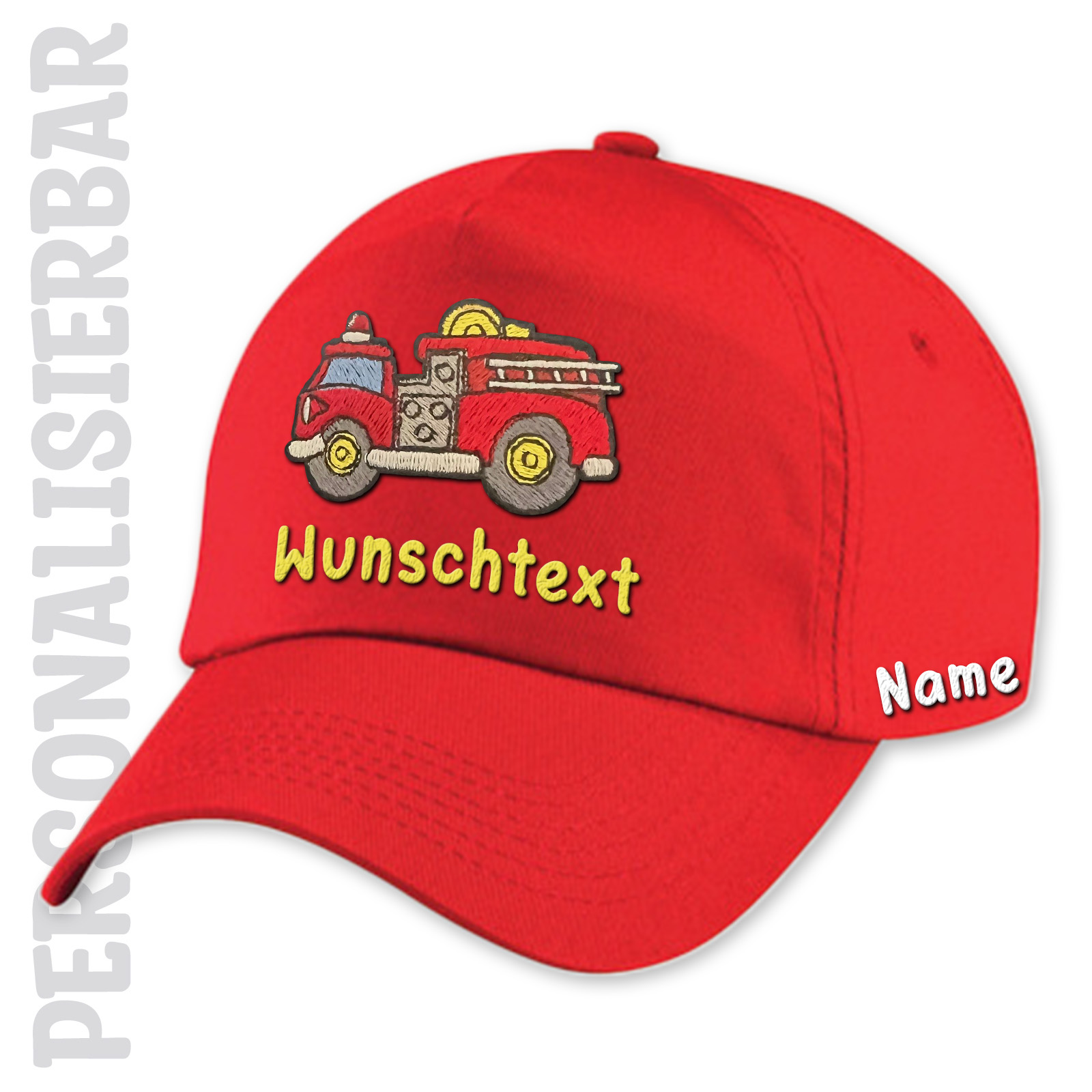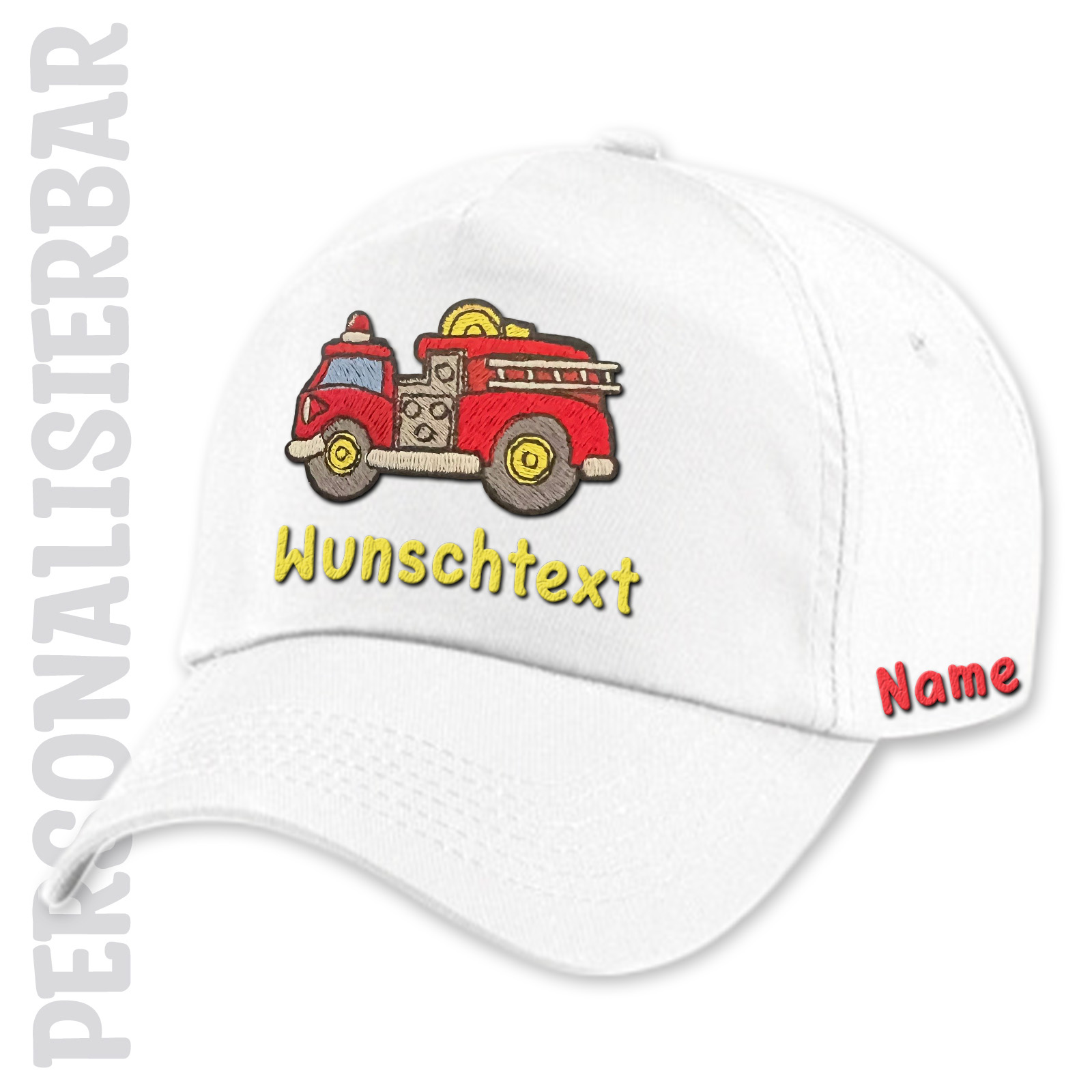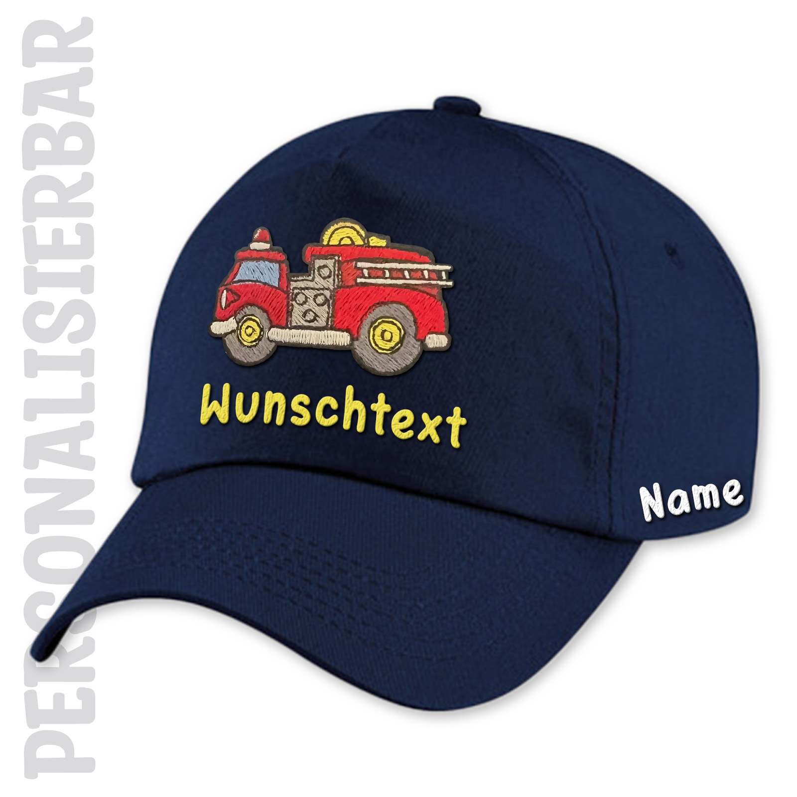 Das Feuerwehrauto-Stickmotiv auf der Vorderseite ist voller Details und Farben, die wirklich herausstechen. Und das Beste ist, dass ihr einen eigenen Wunschtext und euren Namen hinzufügen könnt, um die Kappe zu eurem ganz persönlichen Accessoire zu machen. Perfekt für Kindergeburtstage oder einfach so!