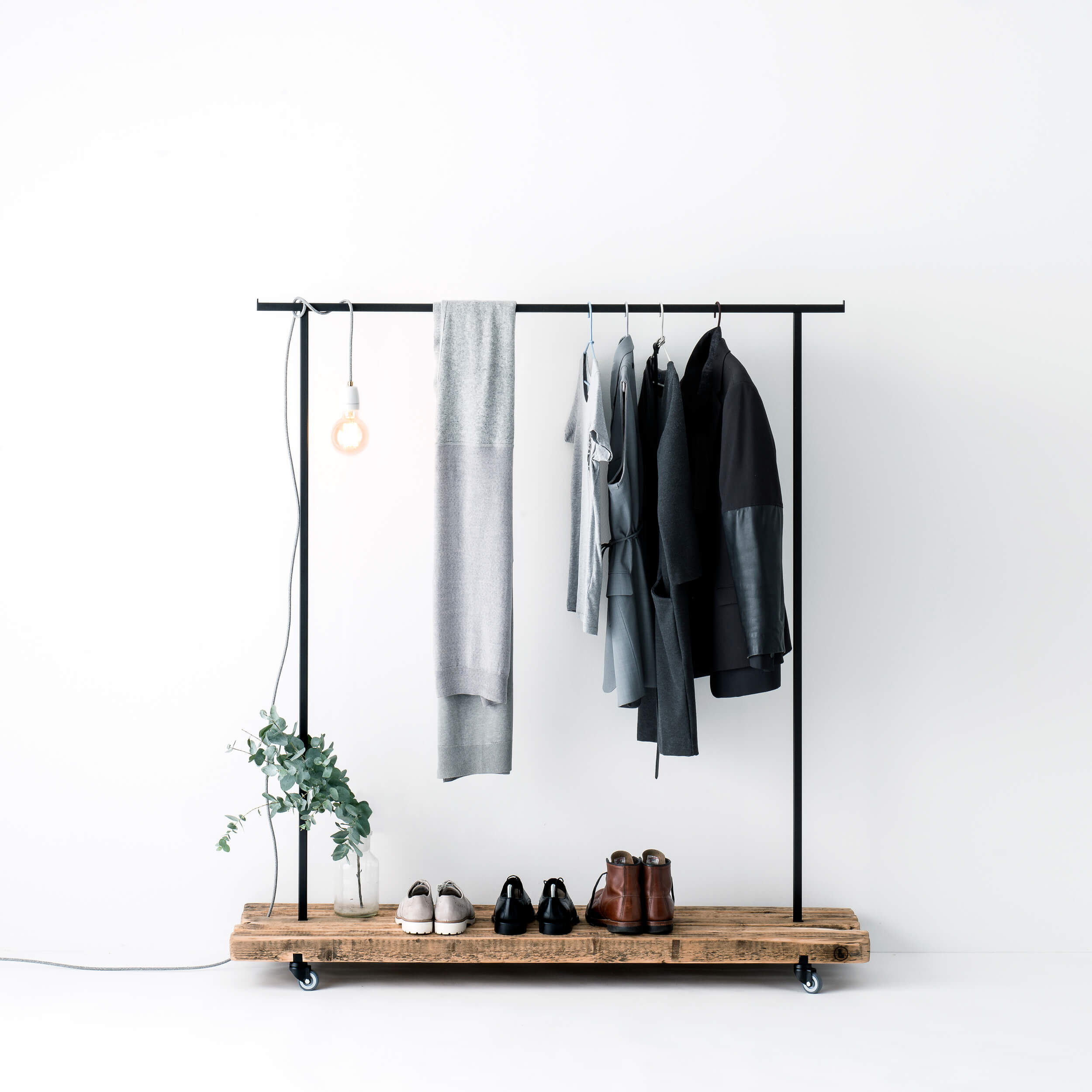 Der stabile Sockel des Kleiderständers ist aus Altholz gefertigt, das Gestänge aus robustem pulverbeschichtetem Metall. Die weichen Rollen sind für alle Böden geeignet.