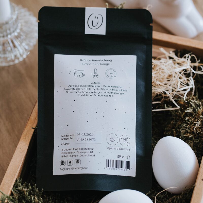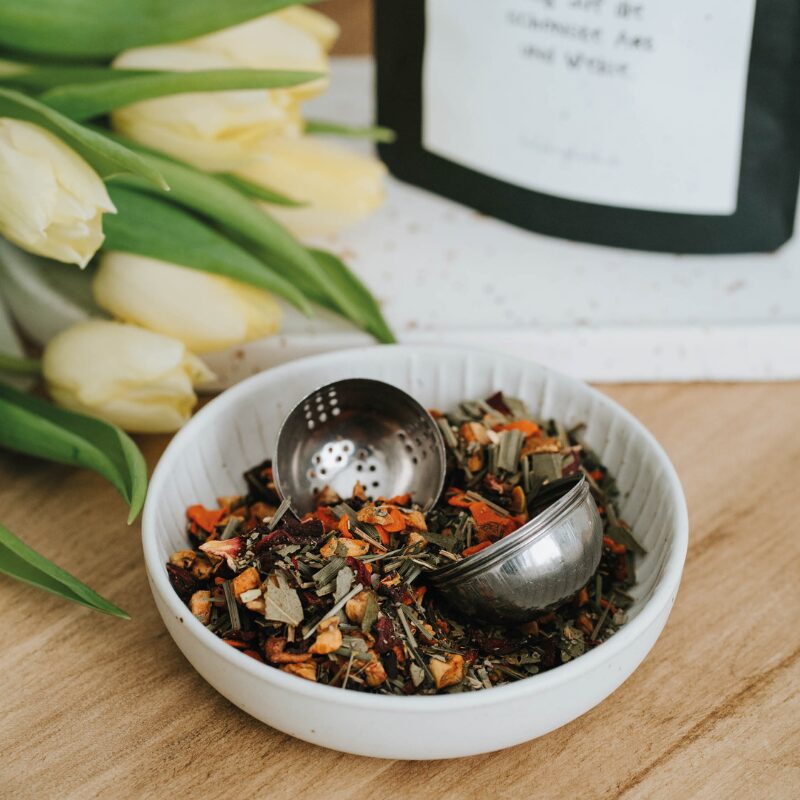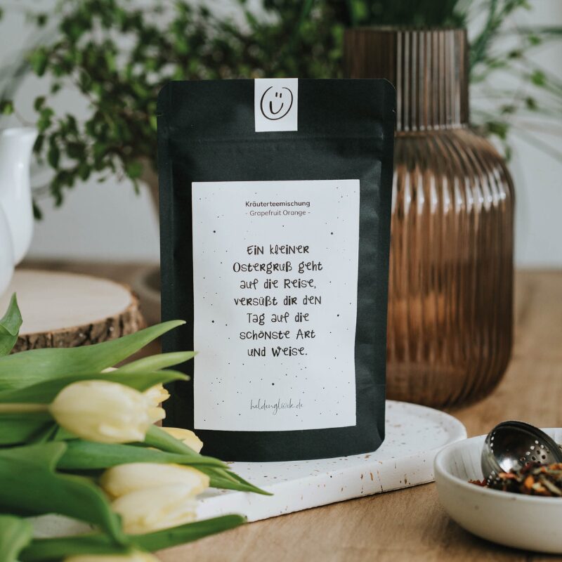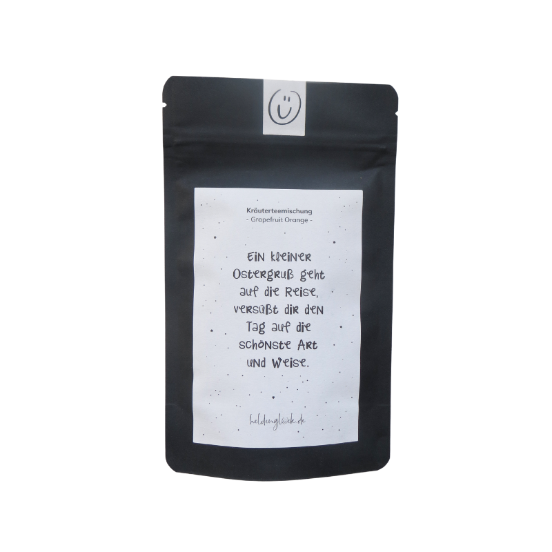 Der Duft und Geschmack von Grapefruit und Orangenstückchen ist fruchtig und frisch. Karottenflocken sorgen für den speziellen Oster-Vibe und zusammen mit Eukalyptusblättern, Rote Beete, Hibiskusblüten und Zitronengras ist diese Teekomposition ein wahres Potpourrie. Das sind Frühlings- und Ostergrüße, die man Trinken und Schmecken kann und die das Herz wärmen.