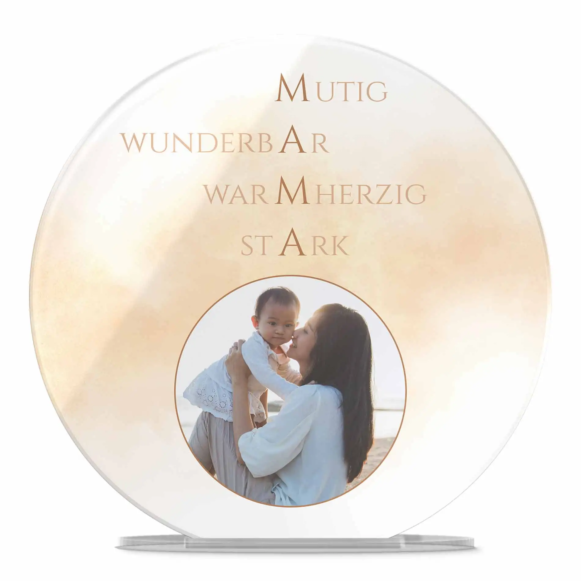 Material: Hochglanz Acrylglas mit UV Druck – Größe: 16 x 16 cm oder 25 x 25 cm – Stärke: 5mm – inklusive Stand Fuß aus klarem Acrylglas (Einstecksystem)