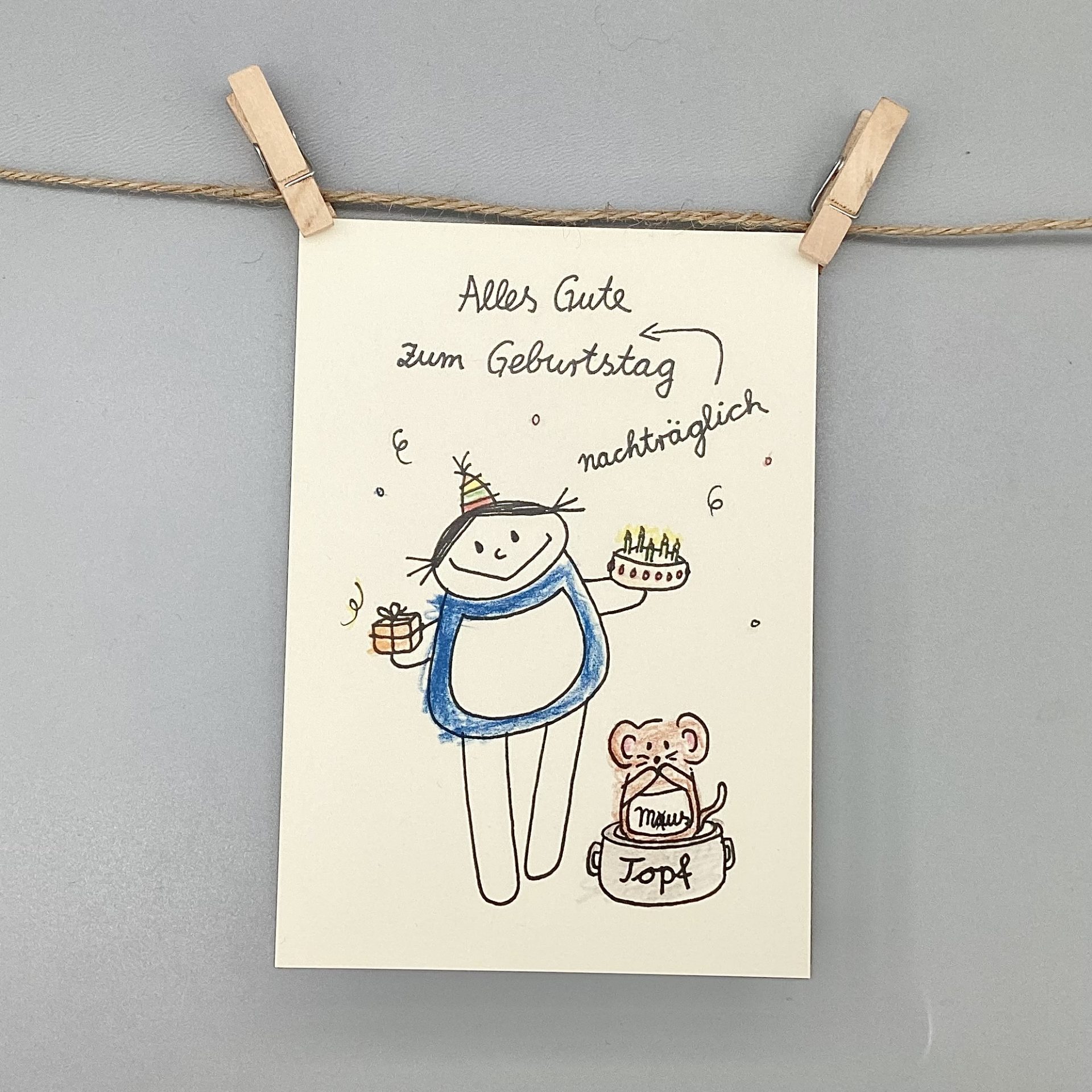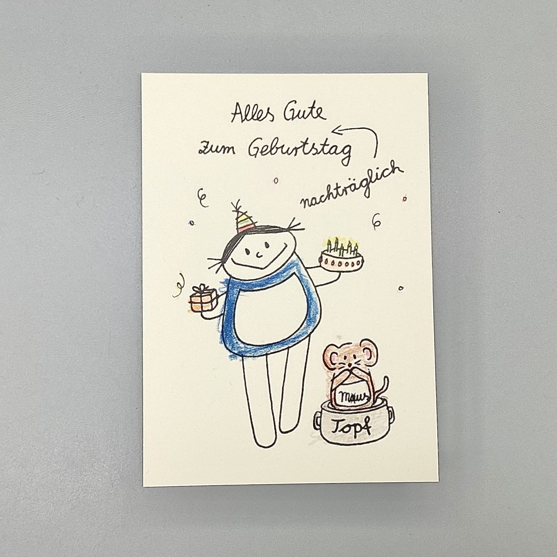 Die Karte sorgt sicher für ein Lächeln und zeigt: Auch ein nachträglicher Geburtstagsgruß kann von Herzen kommen.