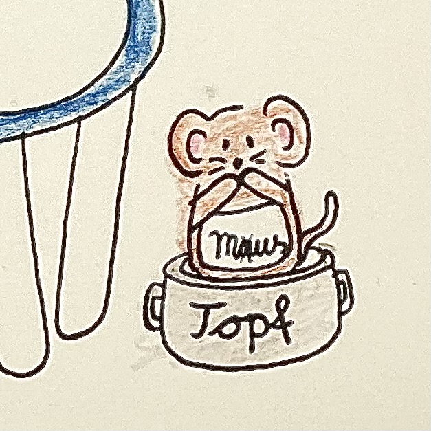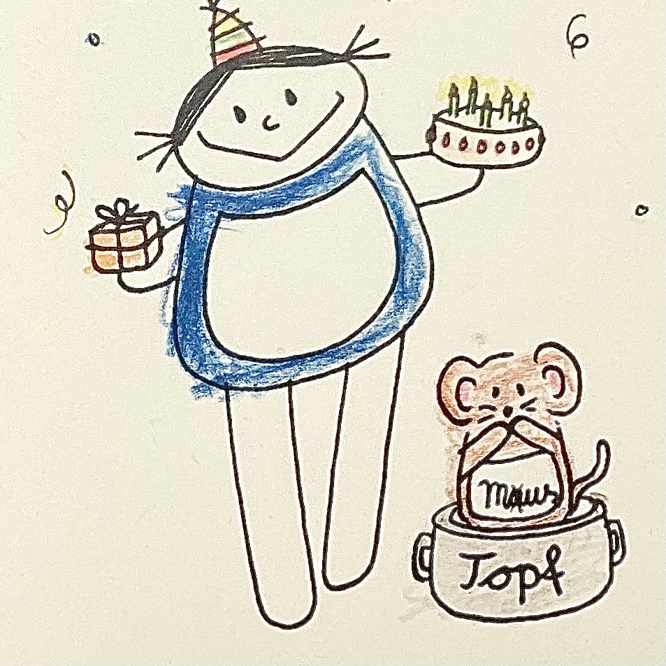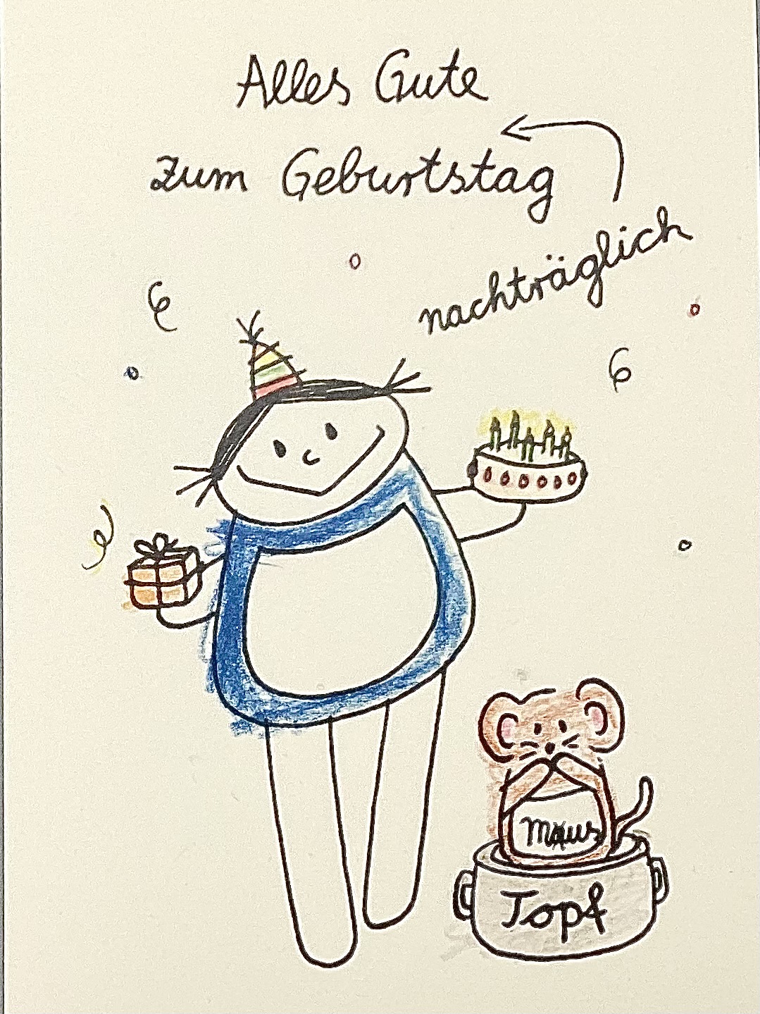 Titel: Alles Gute zum Geburtstag nachträglich. Das „nachträglich“ wird durch einen Pfeil zwischen das „Alles Gute“ und „zum Geburtstag“ gesetzt. ( Hier also mit einem Augenzwinkern auch das nachträglich quasi zu spät ) Neben der weiblichen nini san Figur steht eine Maus in einem Topf. Sie fasst sich erschrocken mit beiden Pfoten für ihr Gesicht. Das Wort Maus ist auf ihrem Bauch geschrieben. Das „a“ bei der Maus ist durchgestrichen, somit wird es ein Wortspiel zu einem: Mustopf.