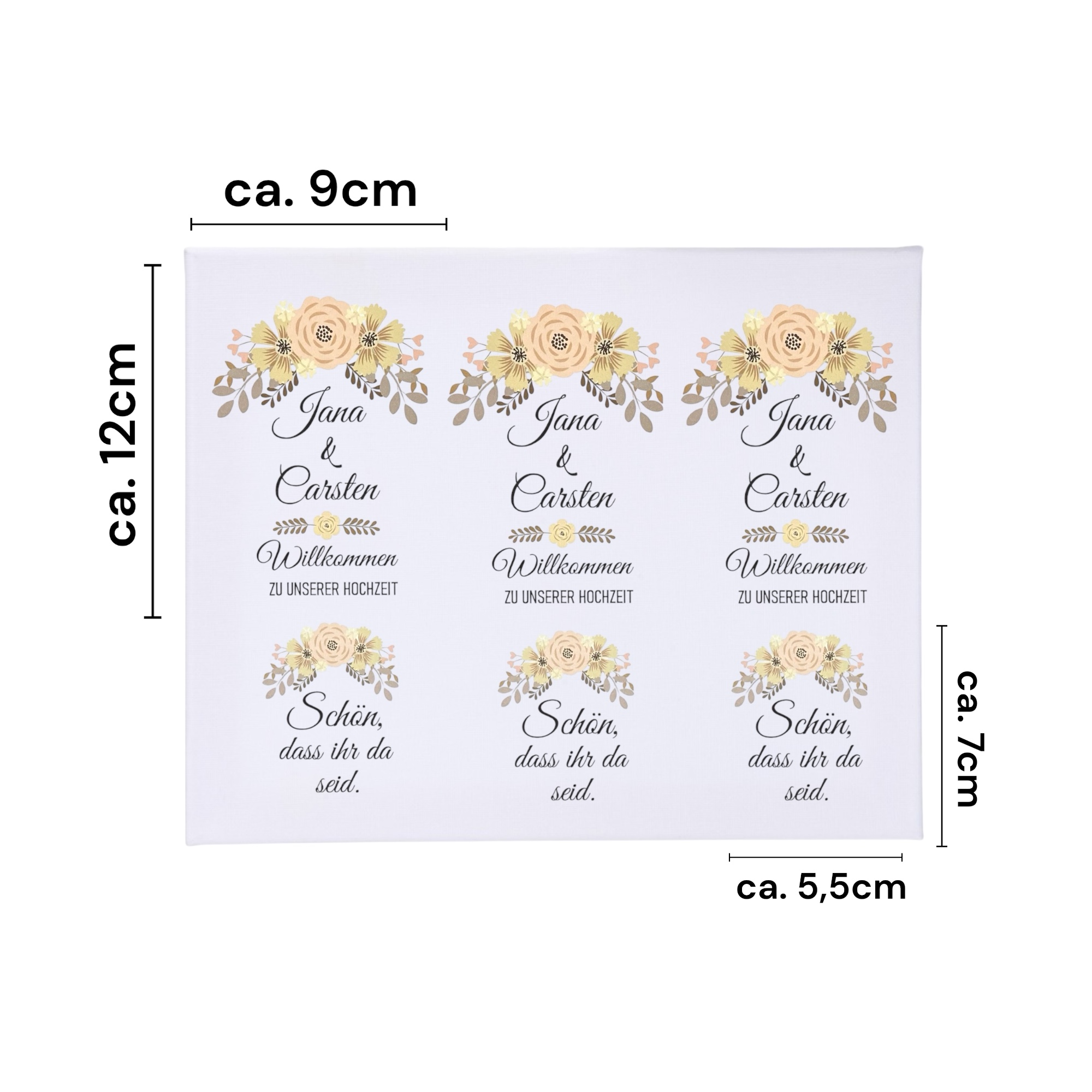 Verleihen Sie Ihrer Hochzeitsfeier einen einzigartigen und persönlichen Touch mit unseren hochwertigen RUB ON Stickern. Diese randlosen Aufkleber sind perfekt zur Dekoration von Tischaufstellern und Teelichtern geeignet und werden mit Ihren Namen individuell gestaltet. Das elegante Design mit zarten Blumenmotiven in warmen rose- und Beigetönen sowie dekorativen Blättern verleiht Ihrer Tischdekoration eine romantische Note. Jeder Sticker wird sorgfältig in Norddeutschland gefertigt und lässt sich einfach und präzise aufbringen. Das Set enthält sowohl größere Aufkleber für Willkommensschilder als auch kleinere Designs für Teelichter, sodass Sie eine harmonische und durchdachte Festdekoration gestalten können. Die randlosen Aufkleber lassen sich mühelos auf glatte Oberflächen wie Glas, Kunststoff, Holz und Keramik übertragen. Die Sticker haften zuverlässig auf glatten Oberflächen und sorgen für einen professionellen, hochwertigen Look Ihrer Hochzeitsdekoration.