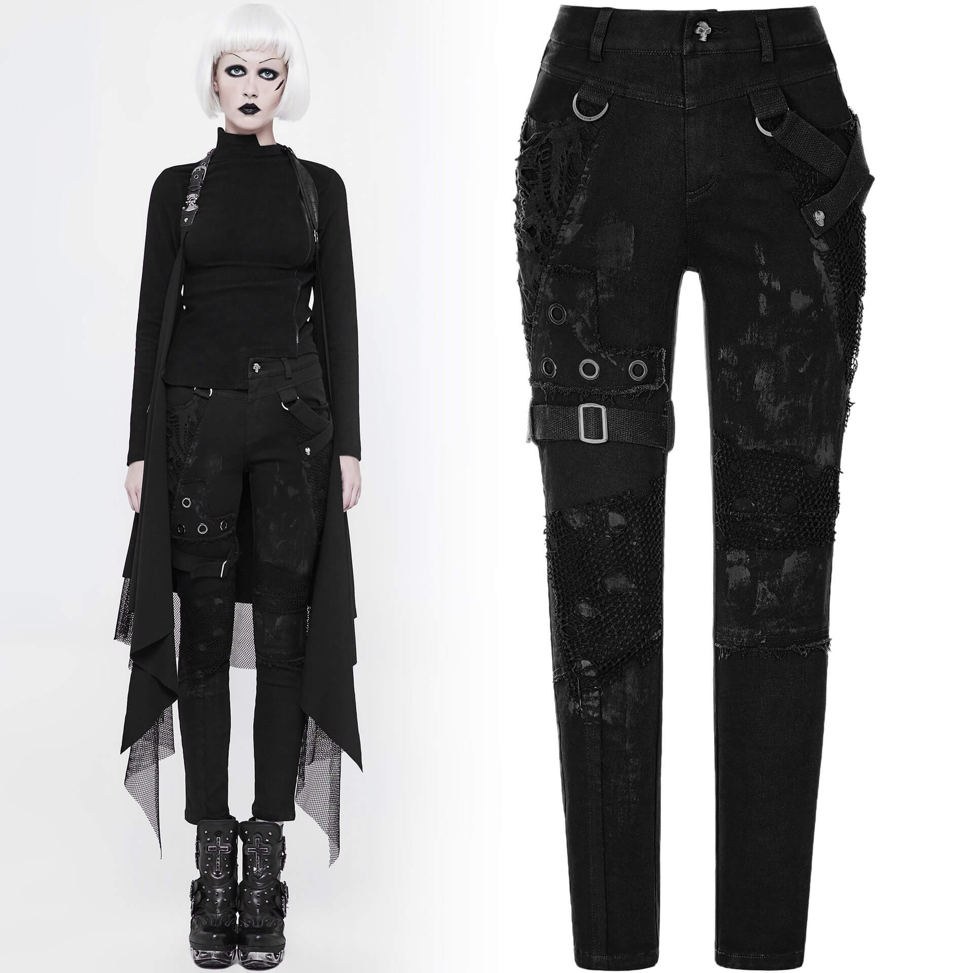 Schwarze Jeanshose von Punkrave mit destroyed Elementen, Ösen und zahlreichen Schnallen und Bändern.