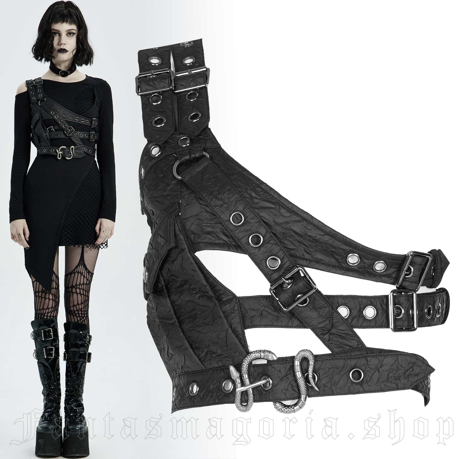 Schwarzer Brust-Harness von Punkrave mit verschiedenen Riemen, Schnallen, einer Tasche sowie einer Schlange als Verschluss.