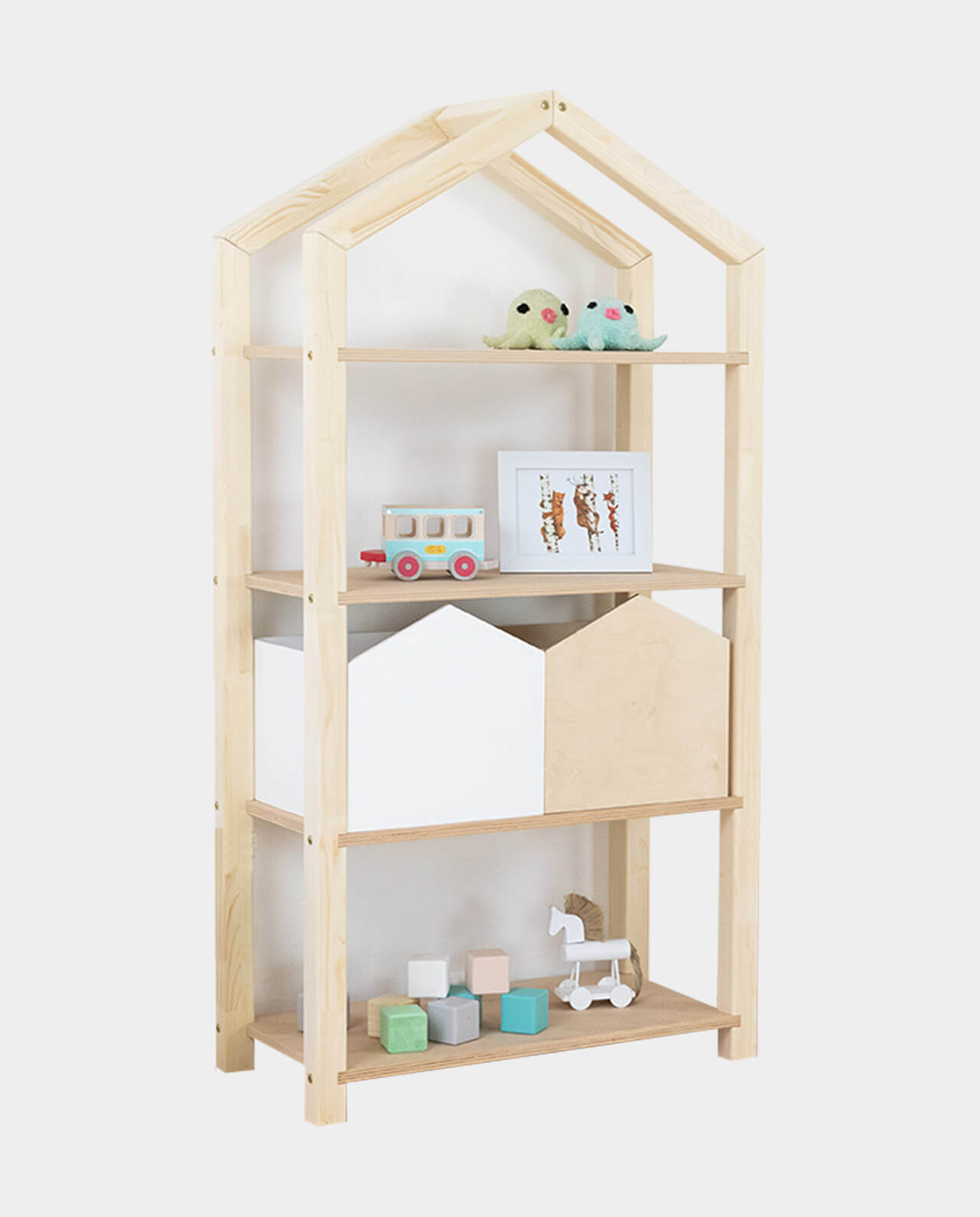 Das Regal TALLY dient als kinderfreundliche Aufbewahrungsmöglichkeit für Bücher, Spielzeug und all das, was im Kinderzimmer einen festen Platz benötigt. Das hausförmige Regal mit Dach ist 77cm Lang, 39cm tief und 152cm hoch. Es ist aus hochwertigem Massivholz handgefertigt. Wähle die Farbvariante, die am besten ins Kinderzimmer passt. Bei der Variante „Natur“ handelt es sich um unbehandeltes Holz. Alle anderen Varianten sind mit 100% natürlichen, ökologischen, antiallergenen Farben lackiert. Die Holzmaserung scheint noch durch die Farbe hindurch und gibt dem Regal einen natürlichen Charakter.