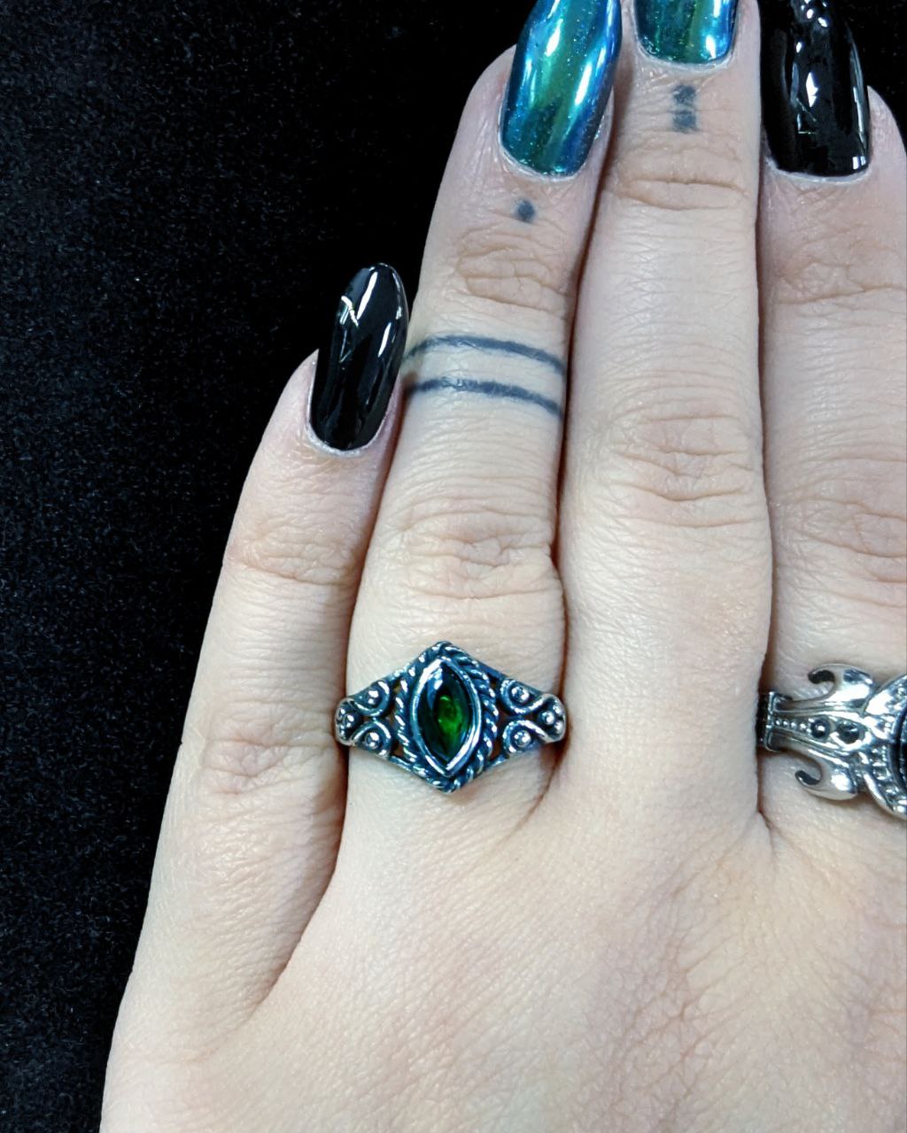 Silberfarbener Ring aus Edelstahl mit einem kleinen grünen Zirkonia in oval spitzer Form in der Mitte.