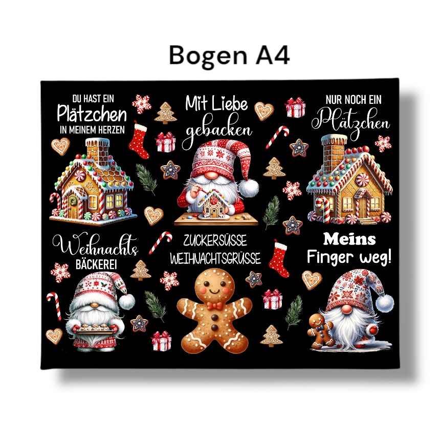 Rub-Ons-Sticker, Keksdose, DIN A4, Weihnachten, Wichtel, randlose Rubons Sticker, Tischdeko, Rubon Aufkleber