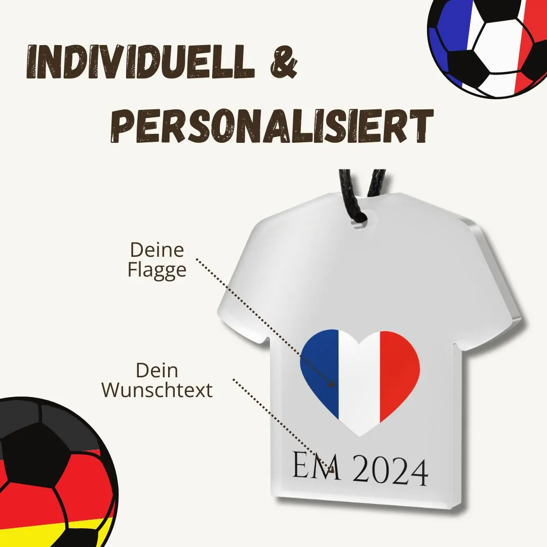 Verleihe deinem Rückspiegel ein Stück individuelle Leidenschaft mit unserem personalisierten Anhänger in Trikotform, gefertigt aus hochwertigem, Hochglanz Acrylglas. Dieses einzigartige Accessoire ist die perfekte Wahl für Fußballfans, den besten Freund oder deinen Partner, um ihre Begeisterung für das Spiel stilvoll zum Ausdruck zu bringen. Jeder Anhänger wird maßgeschneidert, indem du ihn mit einer Flagge und dem Namen deiner Wahl personalisieren kannst, was ihn zu einem unvergleichlich persönlichen Geschenk macht.