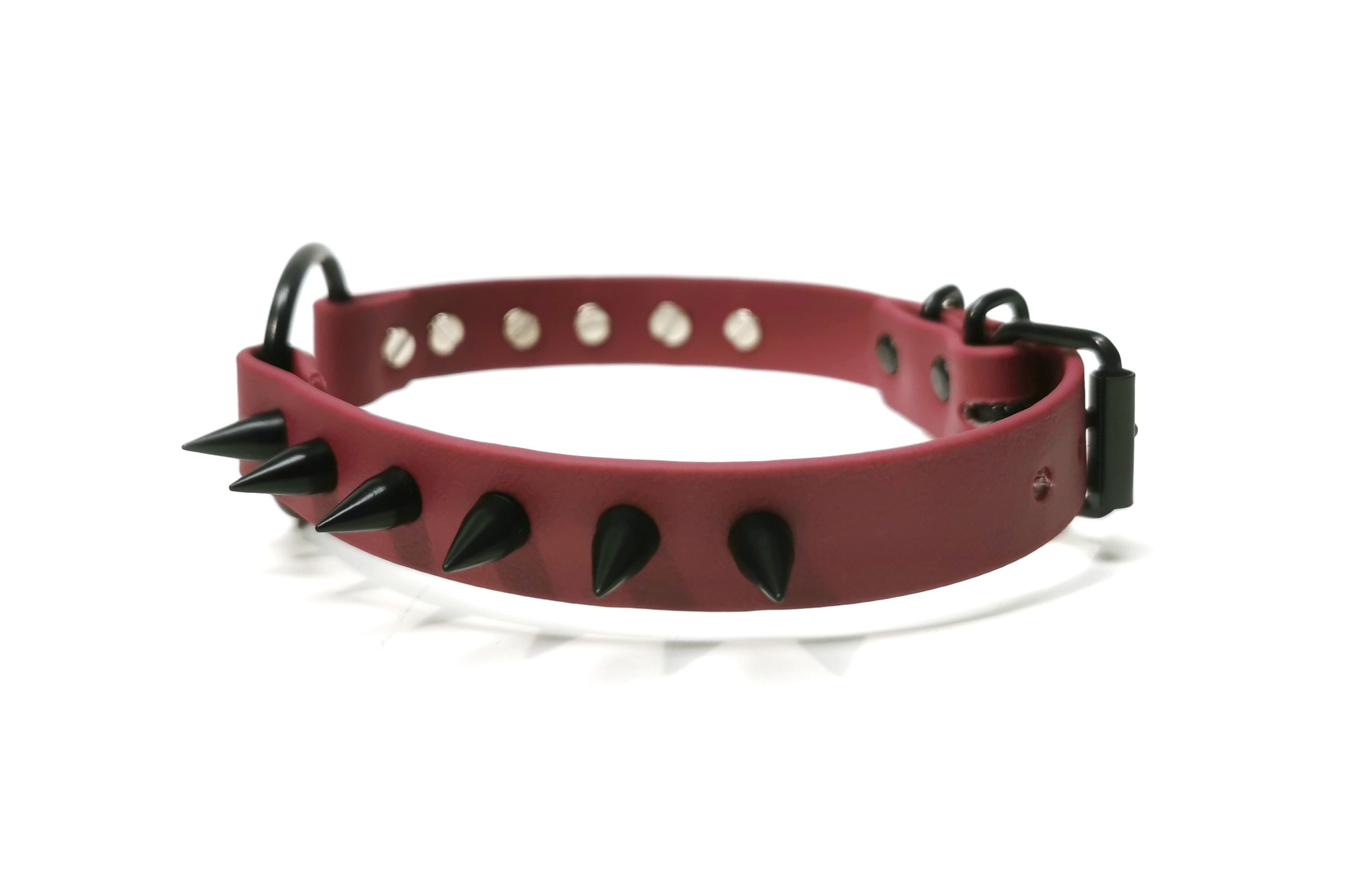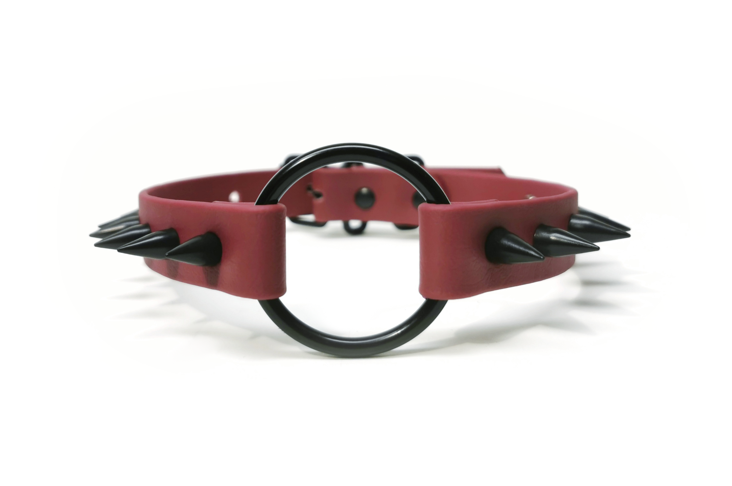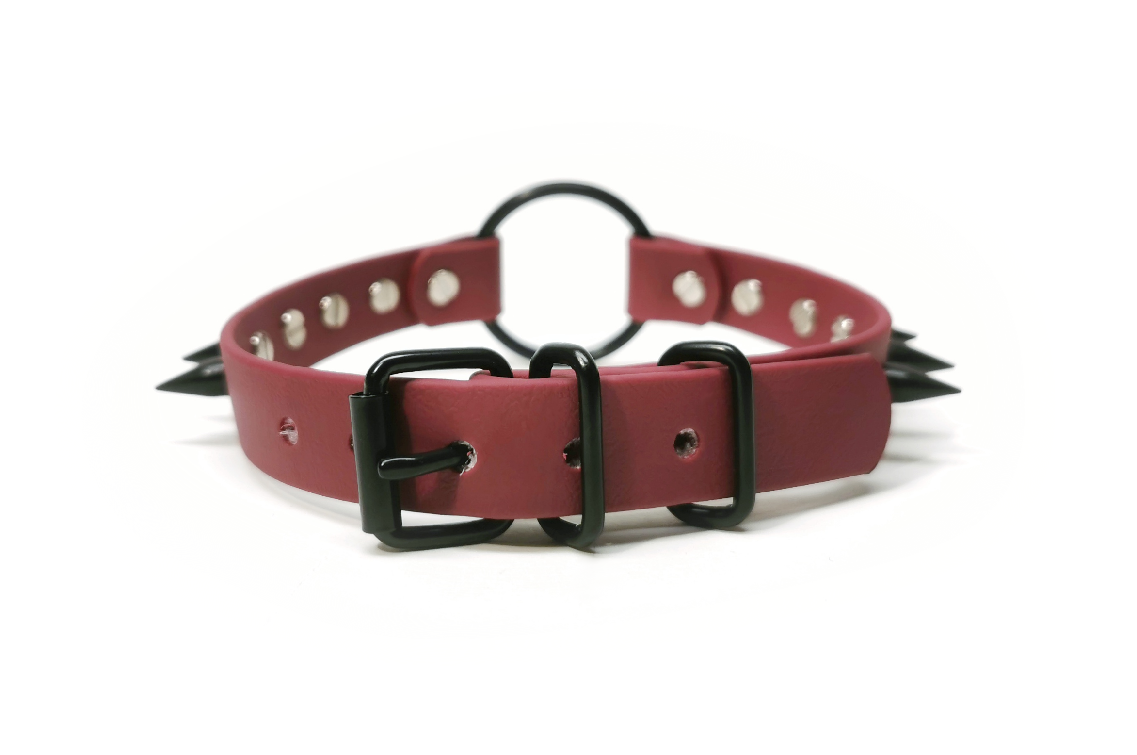 Weinroter veganer handmade Choker von der Künstlerin Sacred Sins mit einem mittig sitzenden schwarzen Ring und zwölf spitzen schwarzen Nieten.