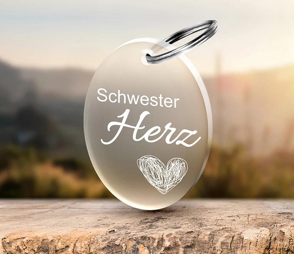 Schlüsselanhänger mit Gravur „Schwesterherz“ Oval aus Acrylglas