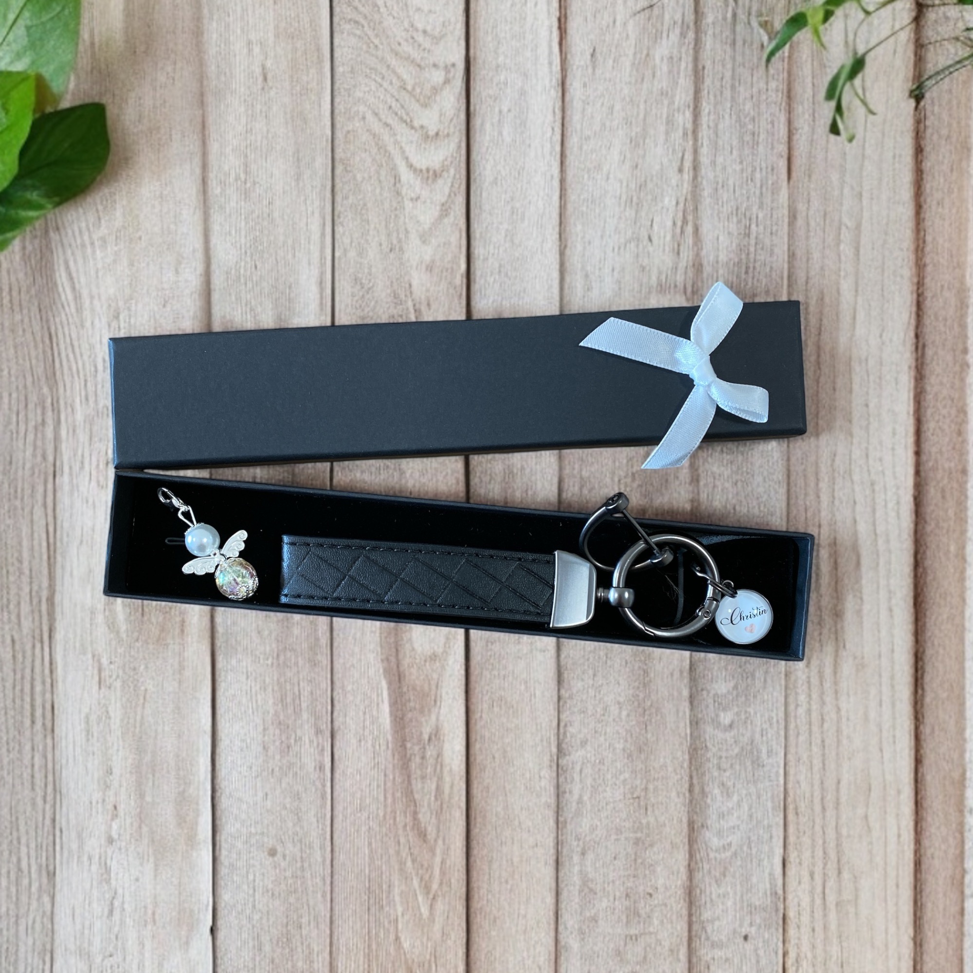 Im Set enthalten: Geschenkbox, Schlüsselband, Anhänger mit Wunschnamen, Schutzengel und Schleife
