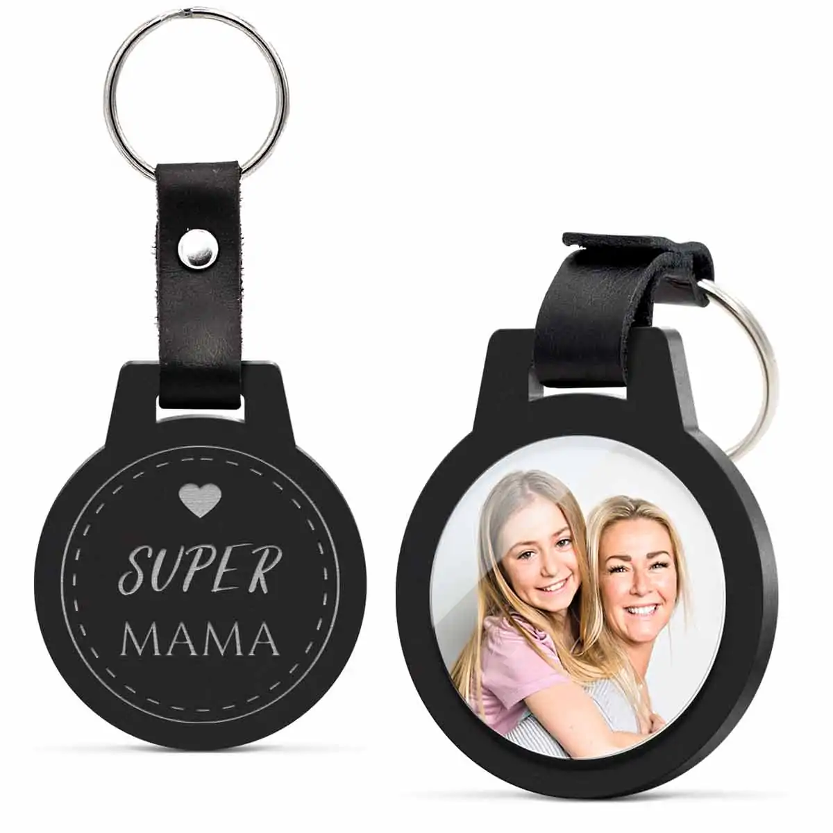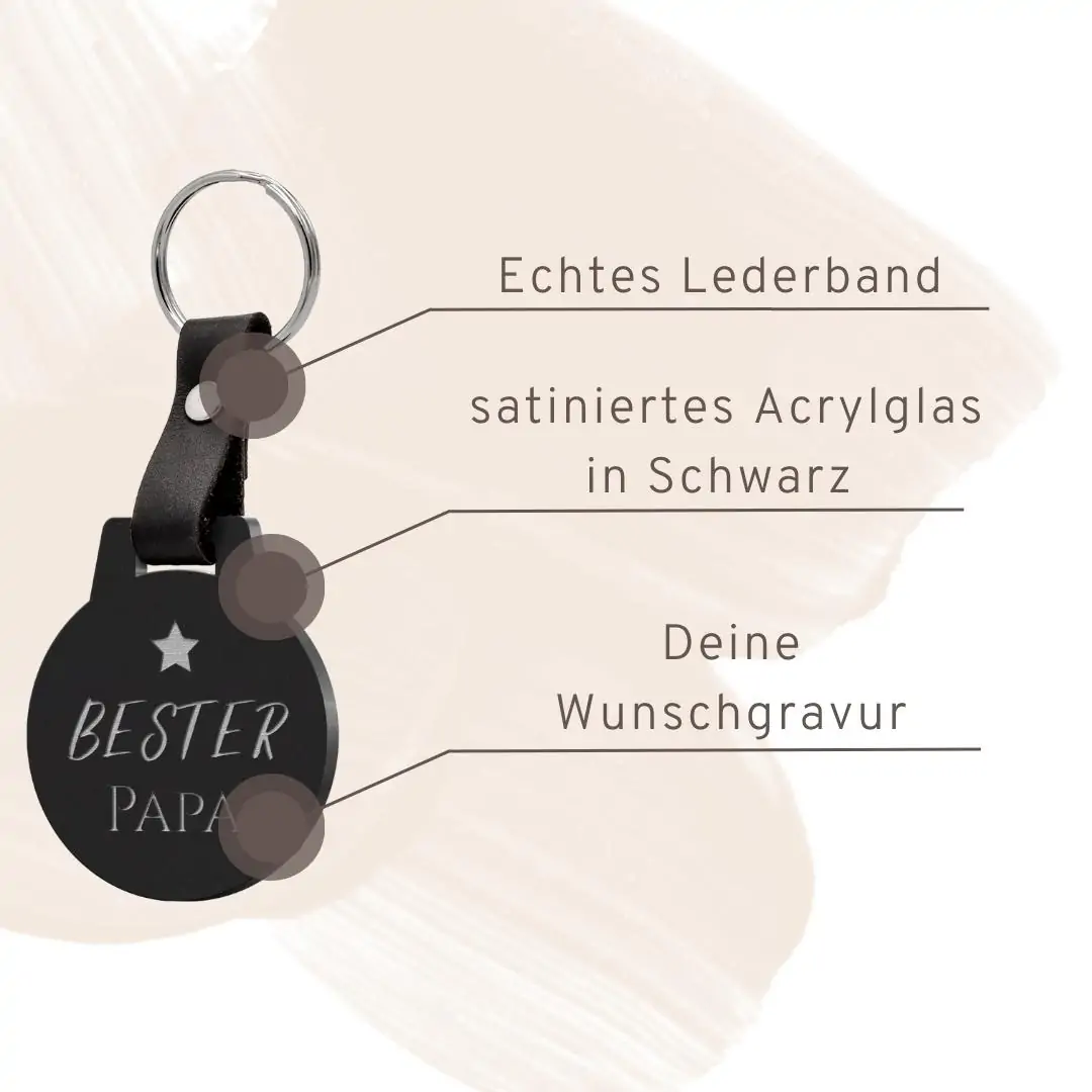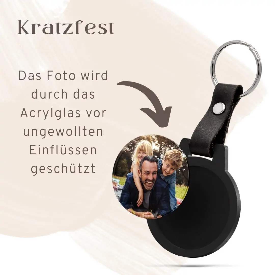 – Material: Acrylglas schwarz satiniert – Form: Rund – Mit Foto-Druck und Gravur – Größe: 4,5 x 5 cm – Stärke: 5 mm – Mit schickem Lederband und Schlüsselring