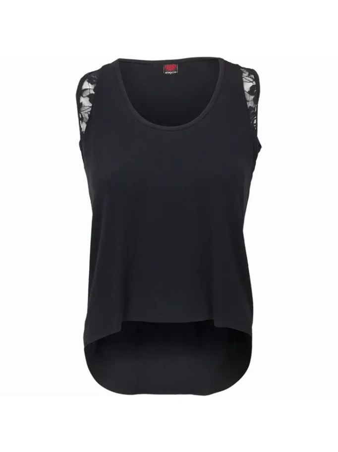 Schwarzes kurz geschnittenes oversized Top von Spiral im Vokuhila-Schnitt mit etwas floraler Spitze an den Ärmelausschnitten.