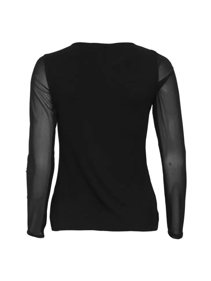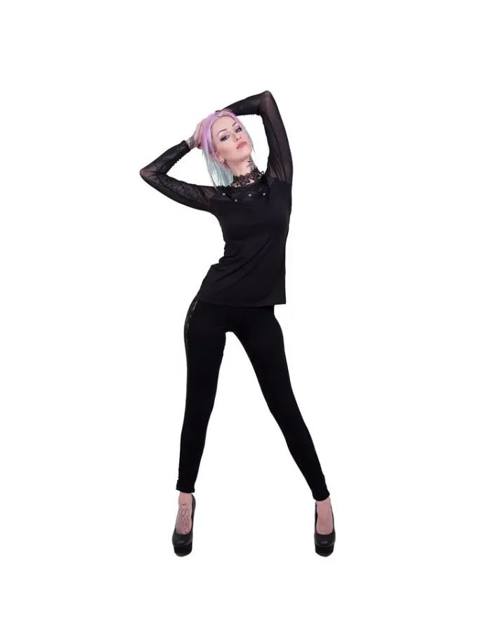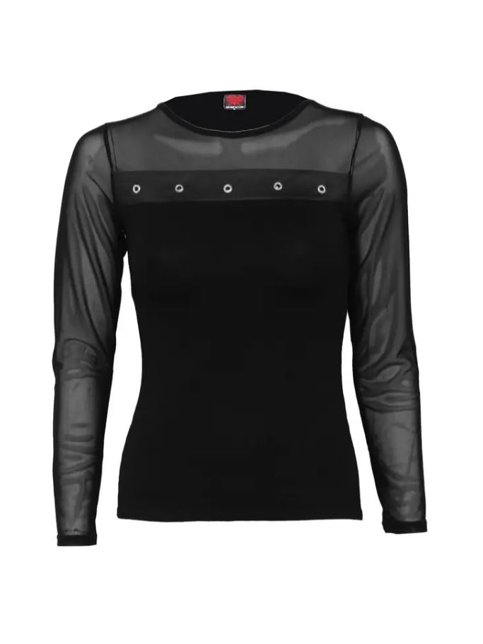 Schwarzes Langarmshirt von Spiral mit transparenten Ärmeln und einer Reihe silberfarbener Ösen im Brustbereich.