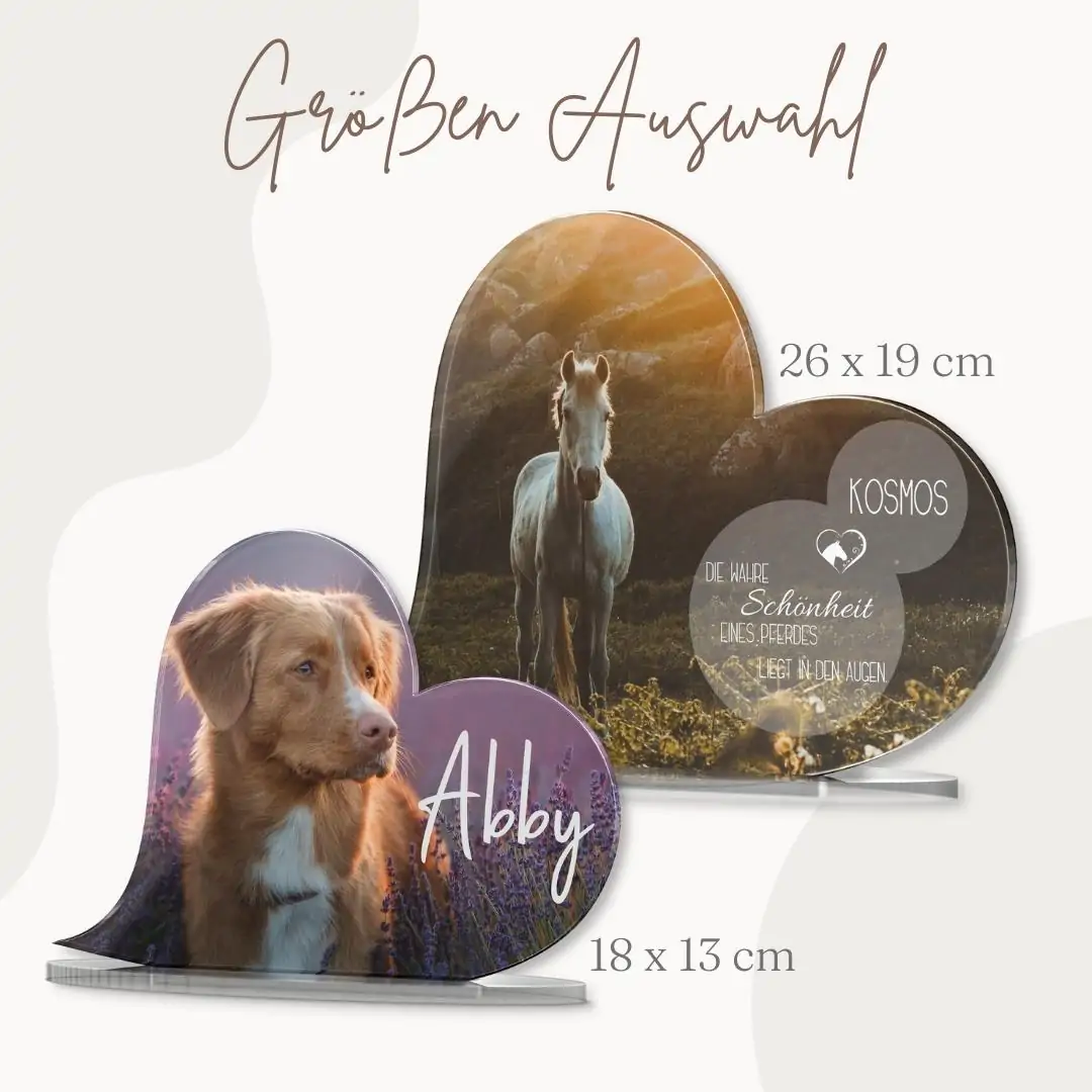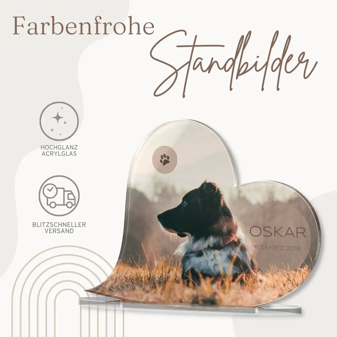– Material: Hochglanz Acrylglas mit UV Druck – Größe: 18 x 13 cm oder 27 x 19 cm – Stärke: 5mm – inklusive Standfuß aus klarem Acrylglas (Einstecksystem) Bitte beachte, dass es sich hierbei um einen Dekoartikel und nicht um einen Gebrauchsgegenstand handelt. Dementsprechend sollte mit dem Standherz verfahren werden.