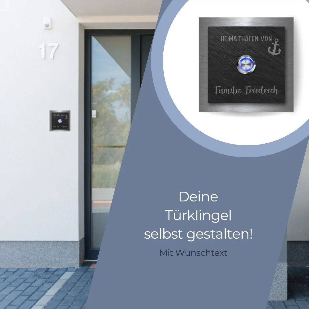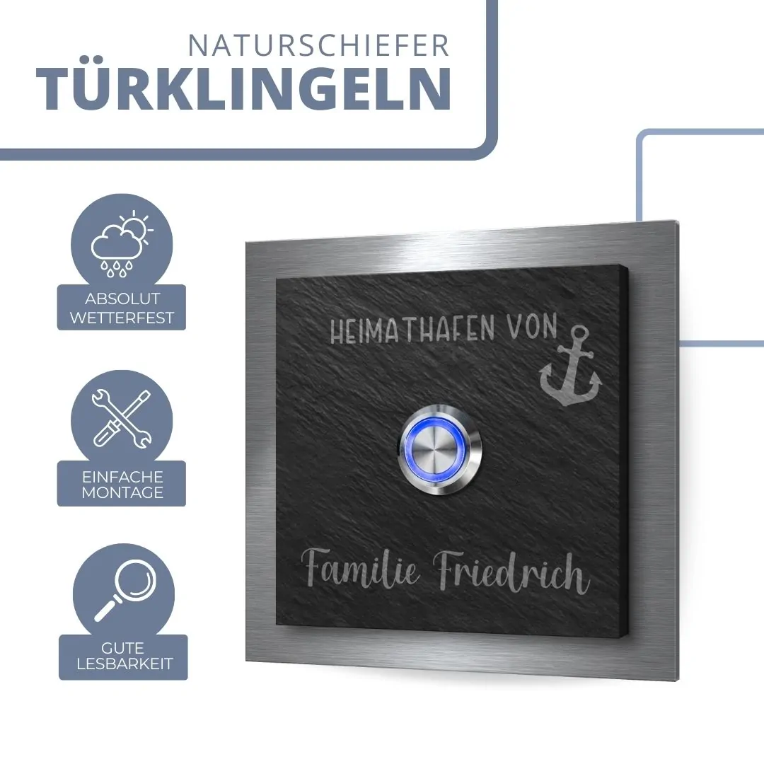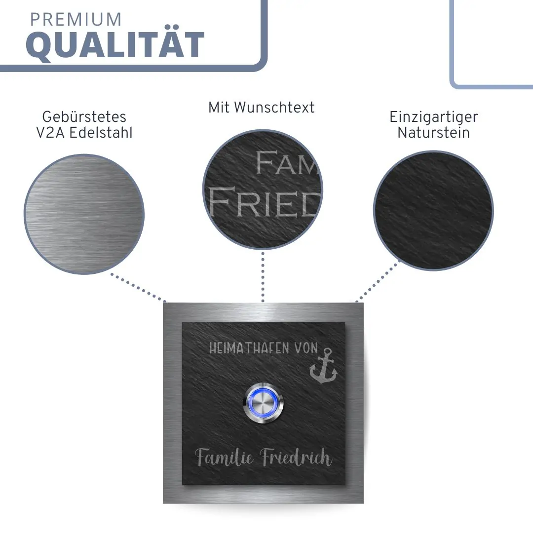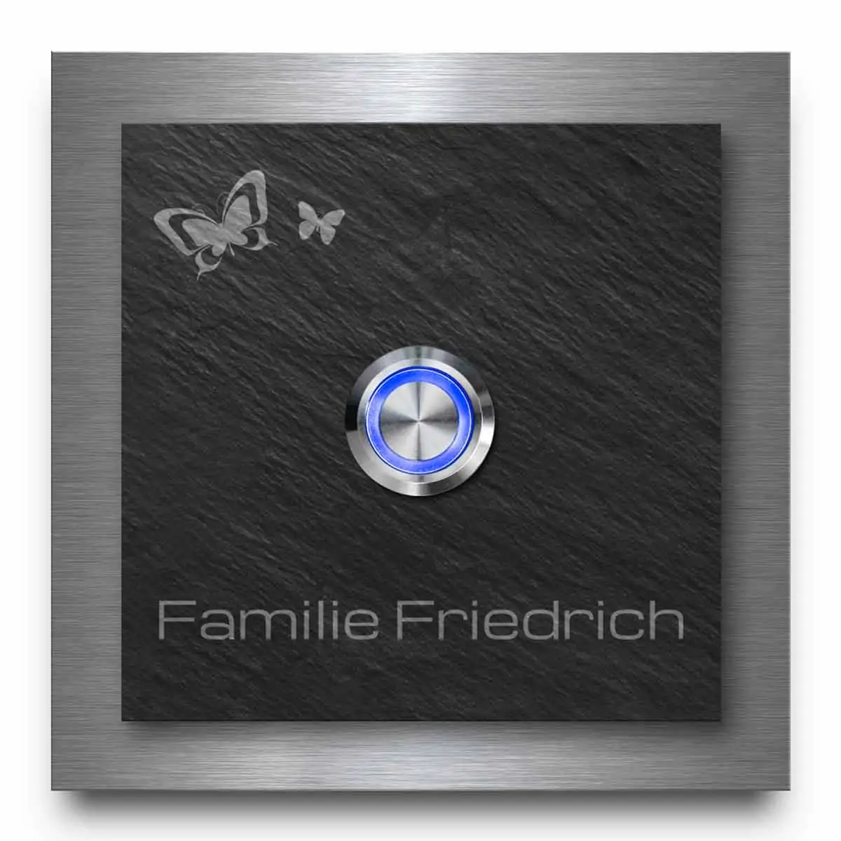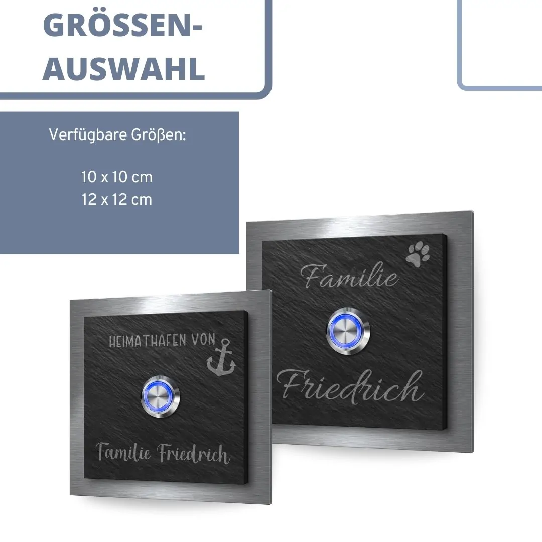 Türklingel aus Schiefer mit Gravur und LED Taster / Modell Friedrich-e ab 10×10 cm