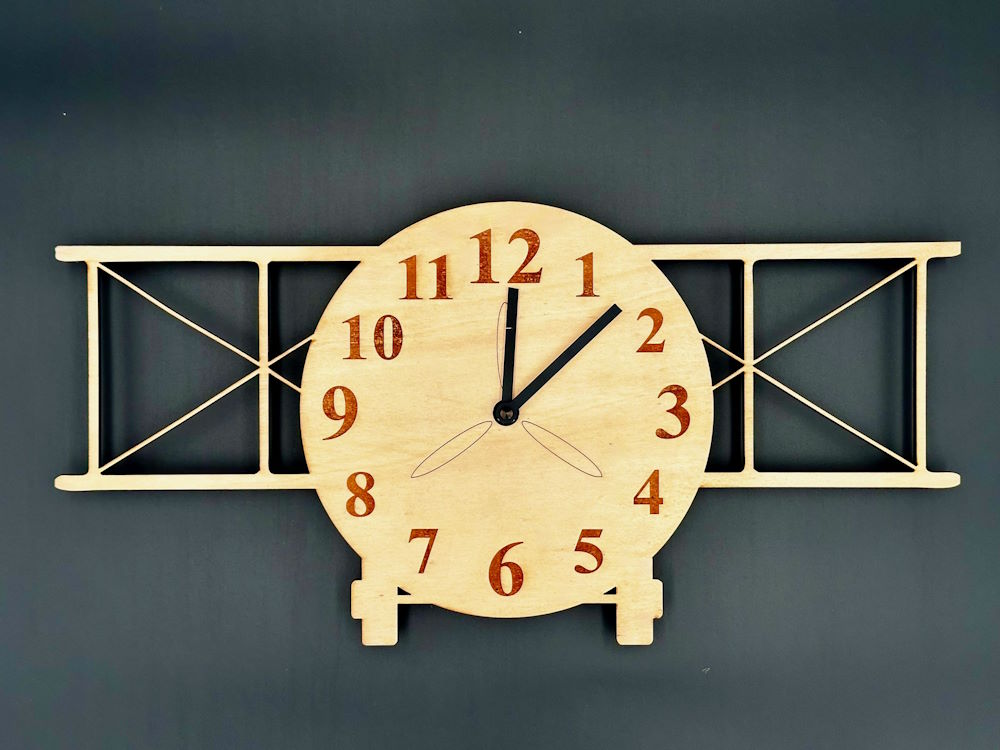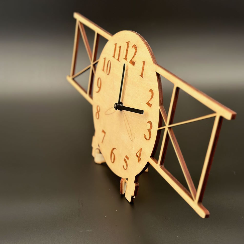 Detaillierte Ausführung: Die Fertigung der komplexen Form erfordert präzises Laserschneiden oder CNC-Fräsen, um die filigranen Tragflächen und Streben exakt darzustellen. Diese Sorgfalt in der Handwerkskunst ist es, die diese Uhr von einfachen Massenprodukten abhebt.