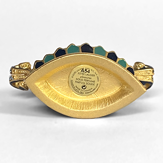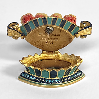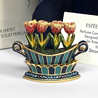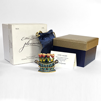 Duft ist „pleasures“, Jardaniere aus goldfarbenem Metall mit türkisem und dunkelblauem Email, der untere Rand ist dekoriert mit türkisen Kristallen, beide Henkel mit dunkelblauen Kristallen, 4 Tulpen mit gelbem, roten und grünem Email, auf den Blütenkelchen außen rote Kristalle, in den Blütenkelchen sitzen größere gelbe Kristalle, goldenes Etikett am Boden, 46 mm hoch, 62 mm breit, unbenutzter Zustand, komplett mit weißem Überkarton, blau/goldener Box, blau-goldenem Satinbeutel und Zertifikat, designed by Jay Strongwater